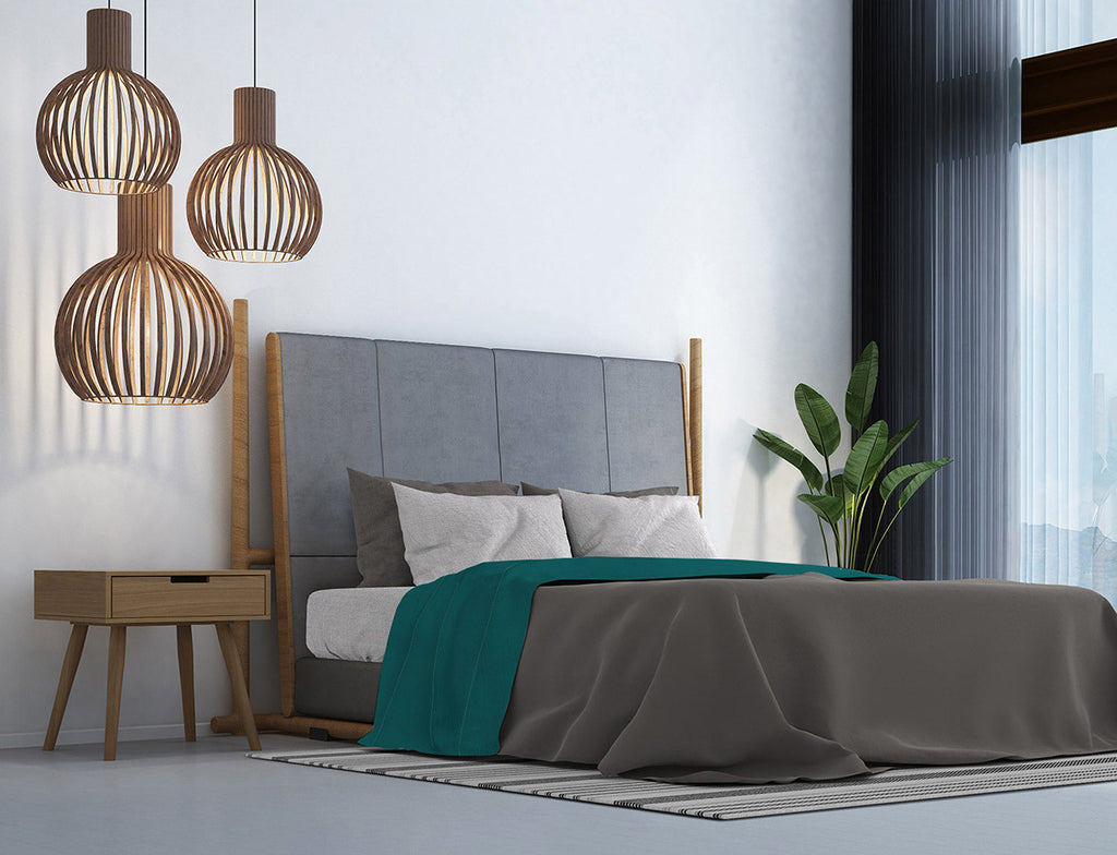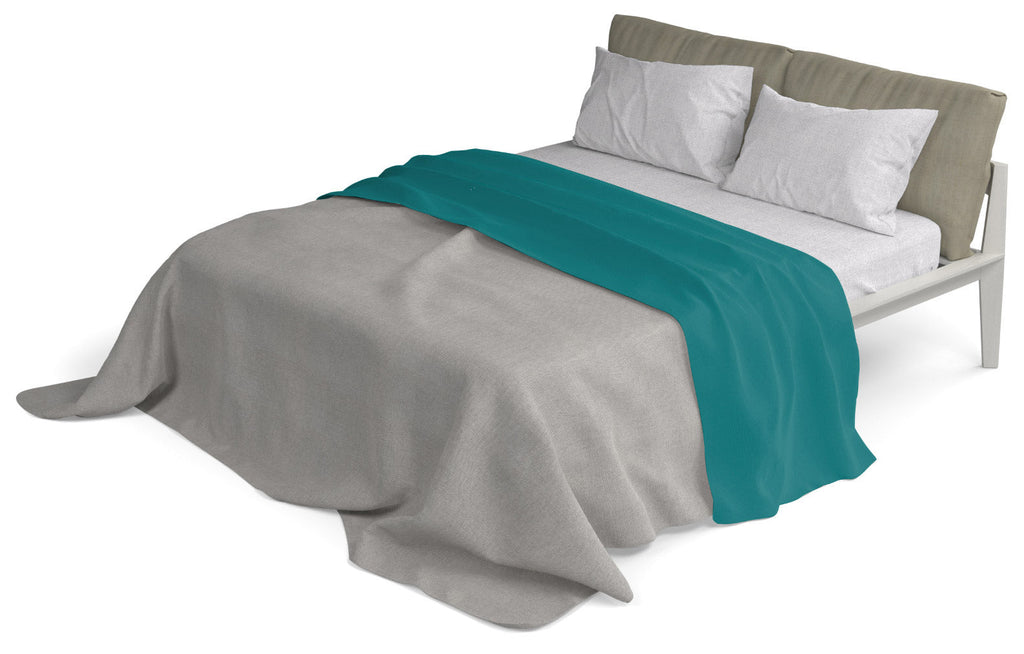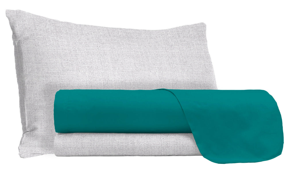 Parure de lit avec drap de dessous et taies d'oreiller gris et drap de dessus coloré. Article fabriqué en Italie, 100% coton avec certification Oeko-Tex.