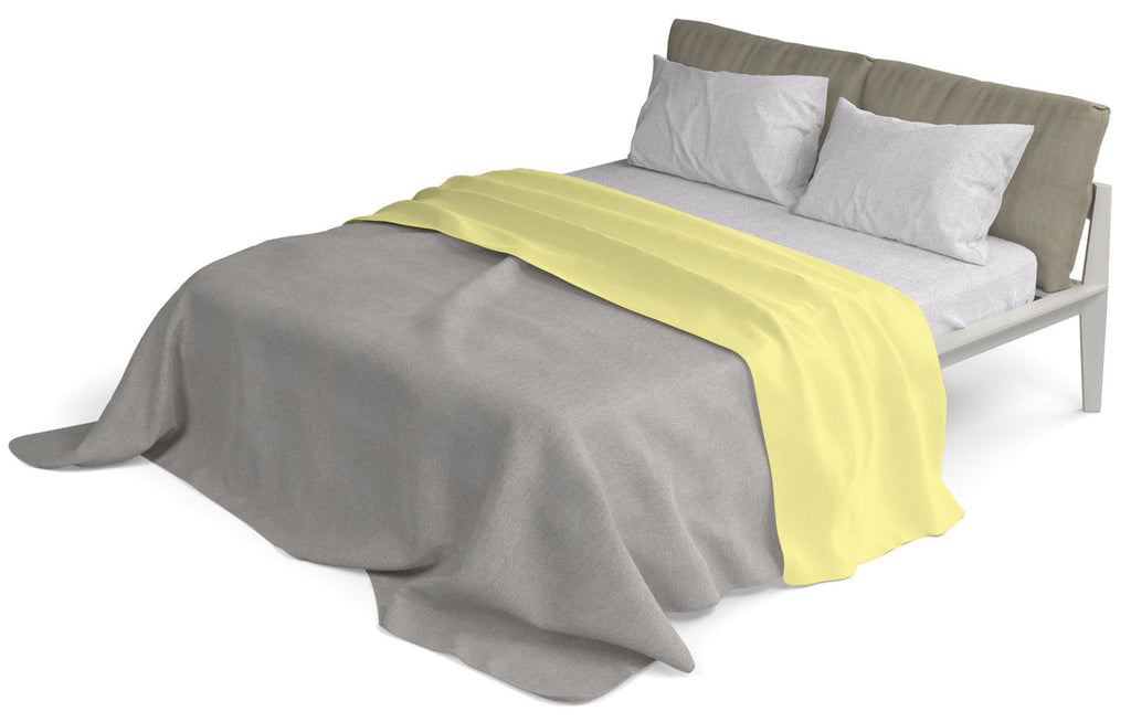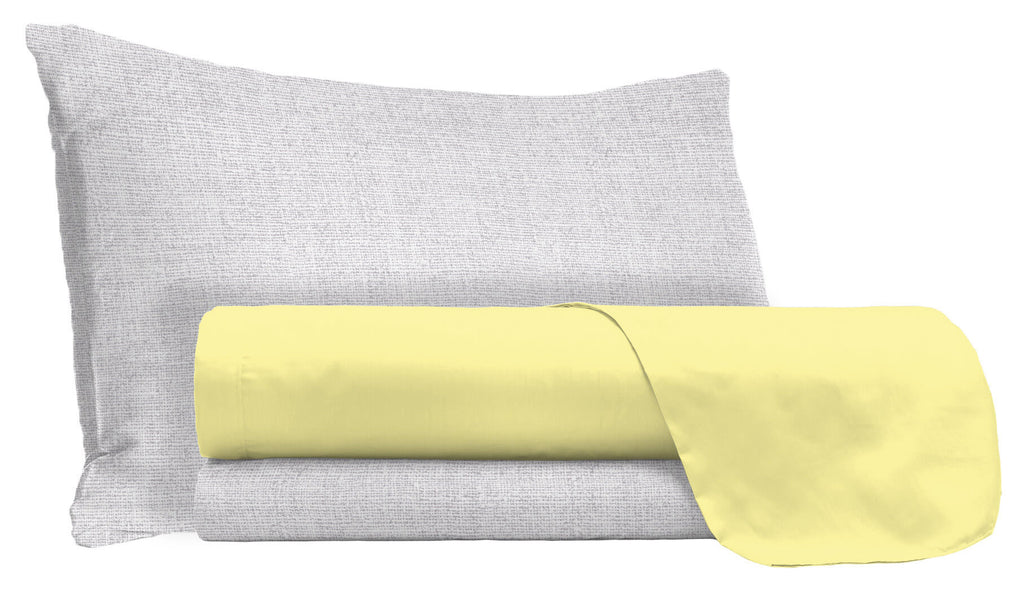 Parure de lit avec drap de dessous et taies d'oreiller gris et drap de dessus coloré. Article fabriqué en Italie, 100% coton avec certification Oeko-Tex.