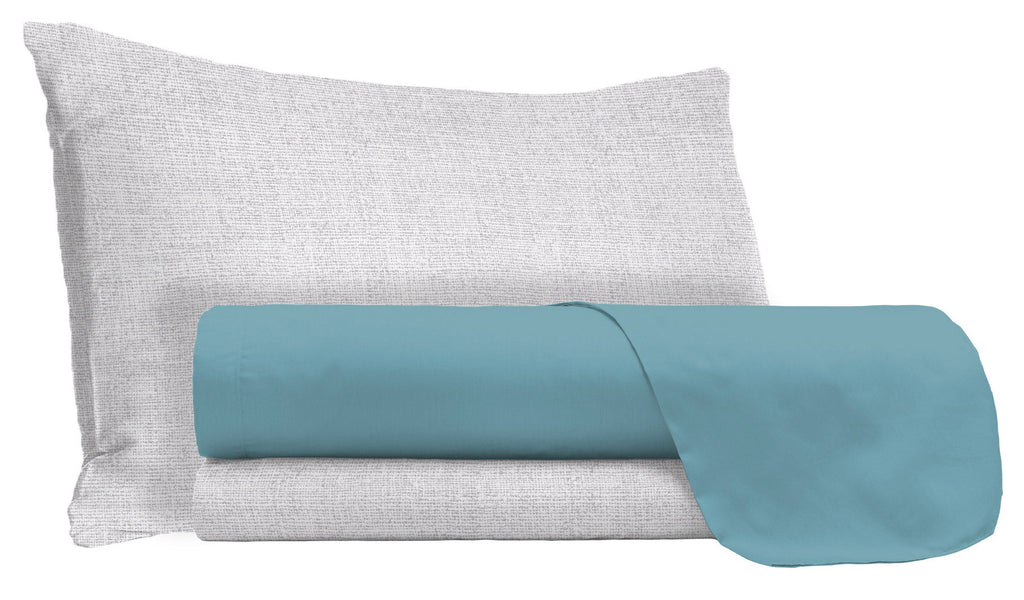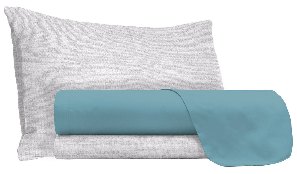 Parure de lit avec drap de dessous et taies d'oreiller gris et drap de dessus coloré. Article fabriqué en Italie, 100% coton avec certification Oeko-Tex.