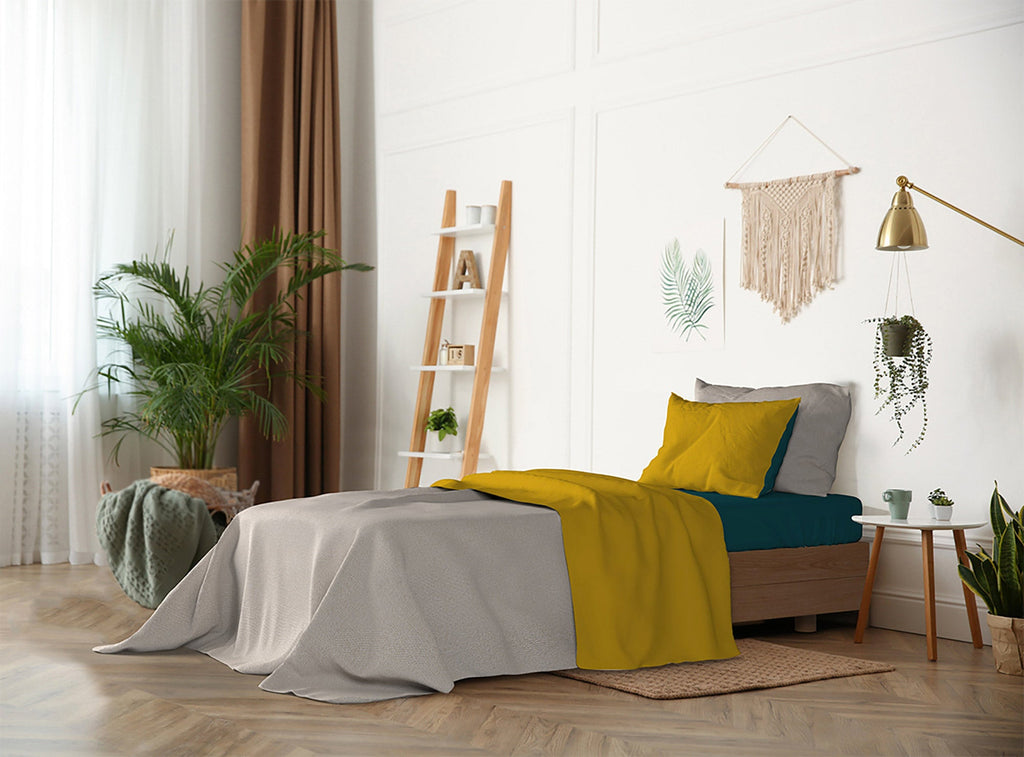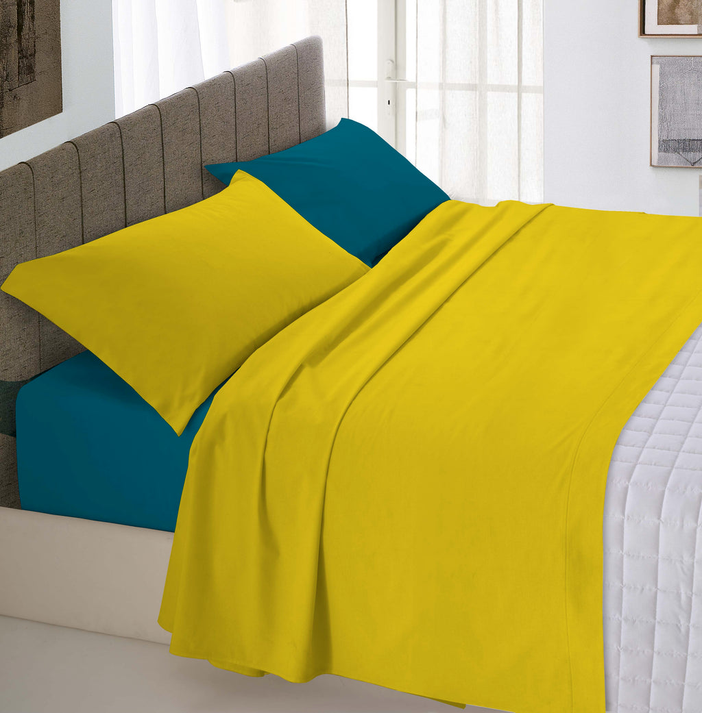 Parure de Draps et Taies d'Oreiller Double Face Ocre/Vert Pétrole