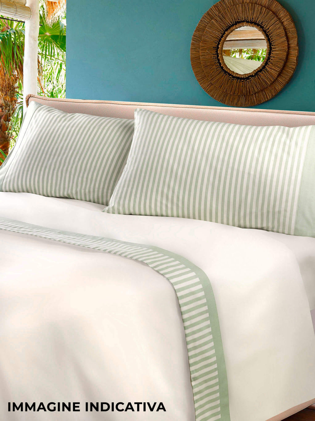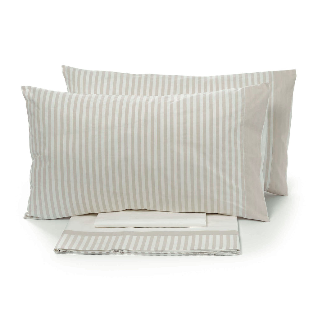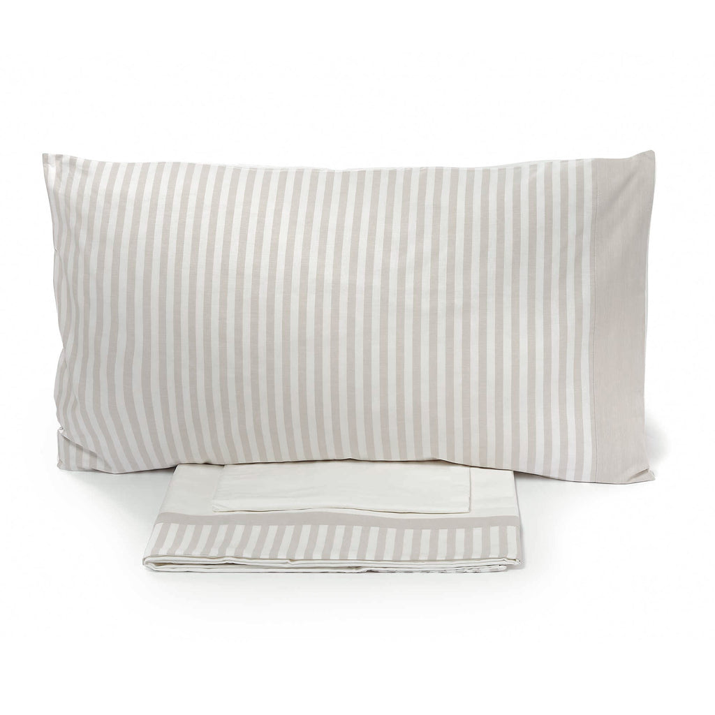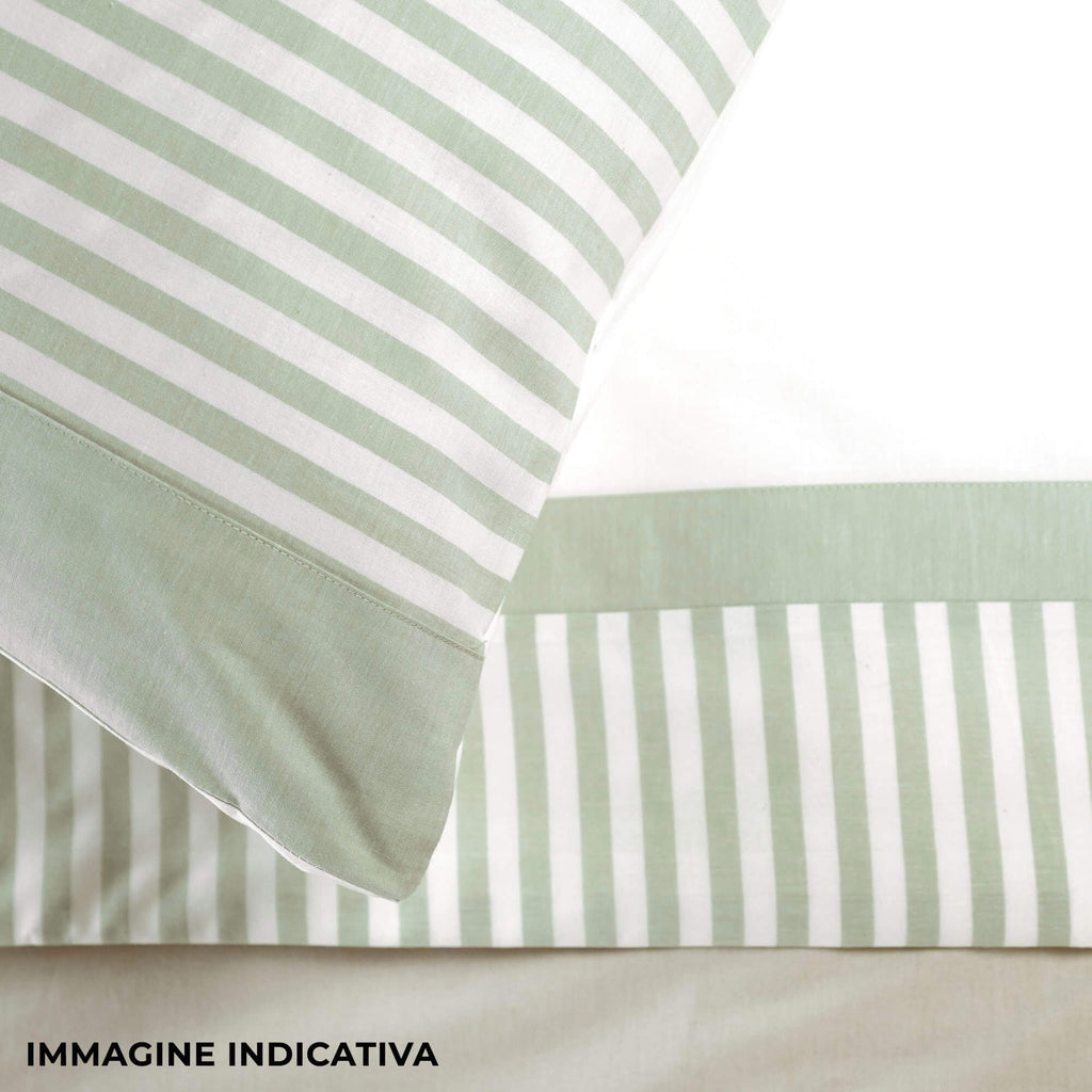 Parure de lit en pur coton teint en fil, rayure moyenne. Comprend : 1 drap de dessus, 1 drap-housse et 2 taies d'oreiller. Entièrement fabriqué et emballé en Italie selon la tradition textile artisanale toscane.
