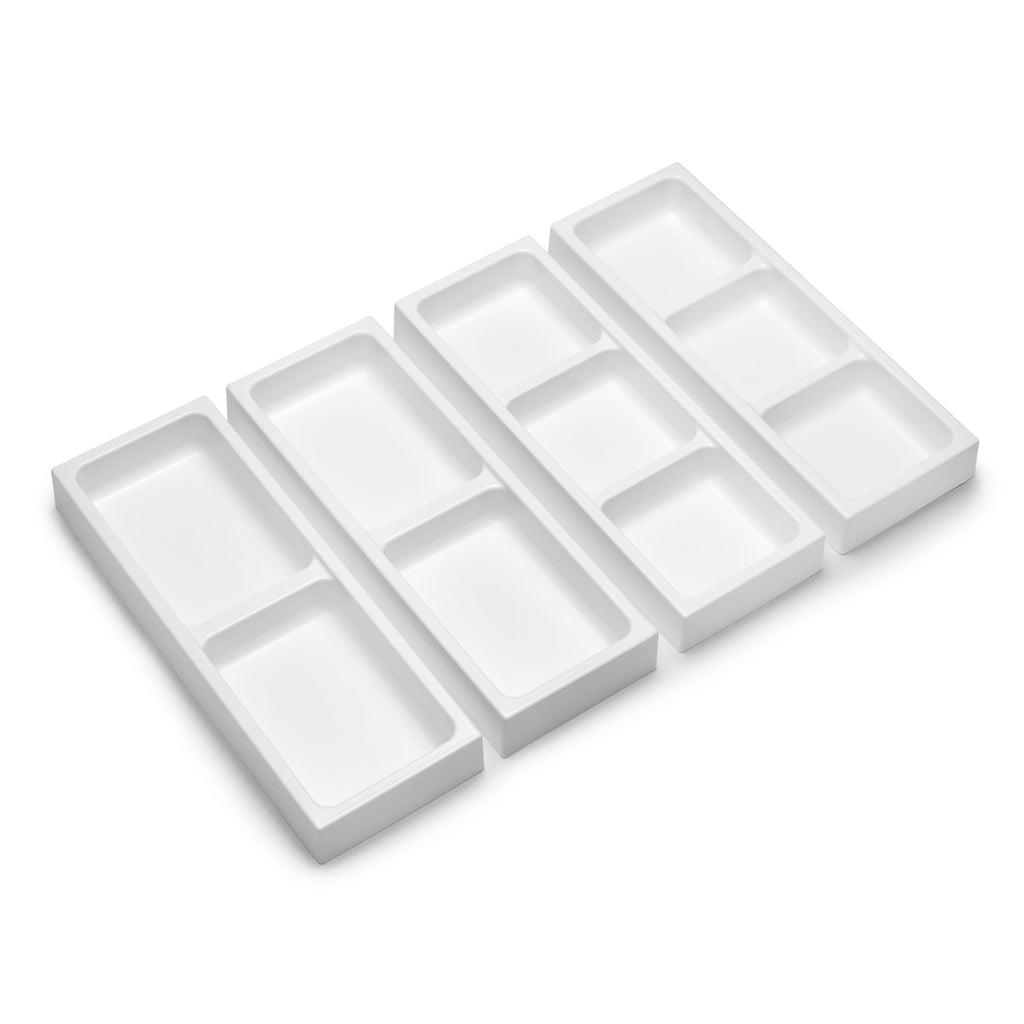 Vengono forniti 4 organizer per cassetti da bagno (2 organizer a 2 fori e 2 organizer a 3 fori). Sono realizzati in plastica ABS, con un'elegante finitura grigio antracite o bianco, colori di tendenza nel design dell'arredo bagno, ideali da abbinare ai cassetti Emuca.