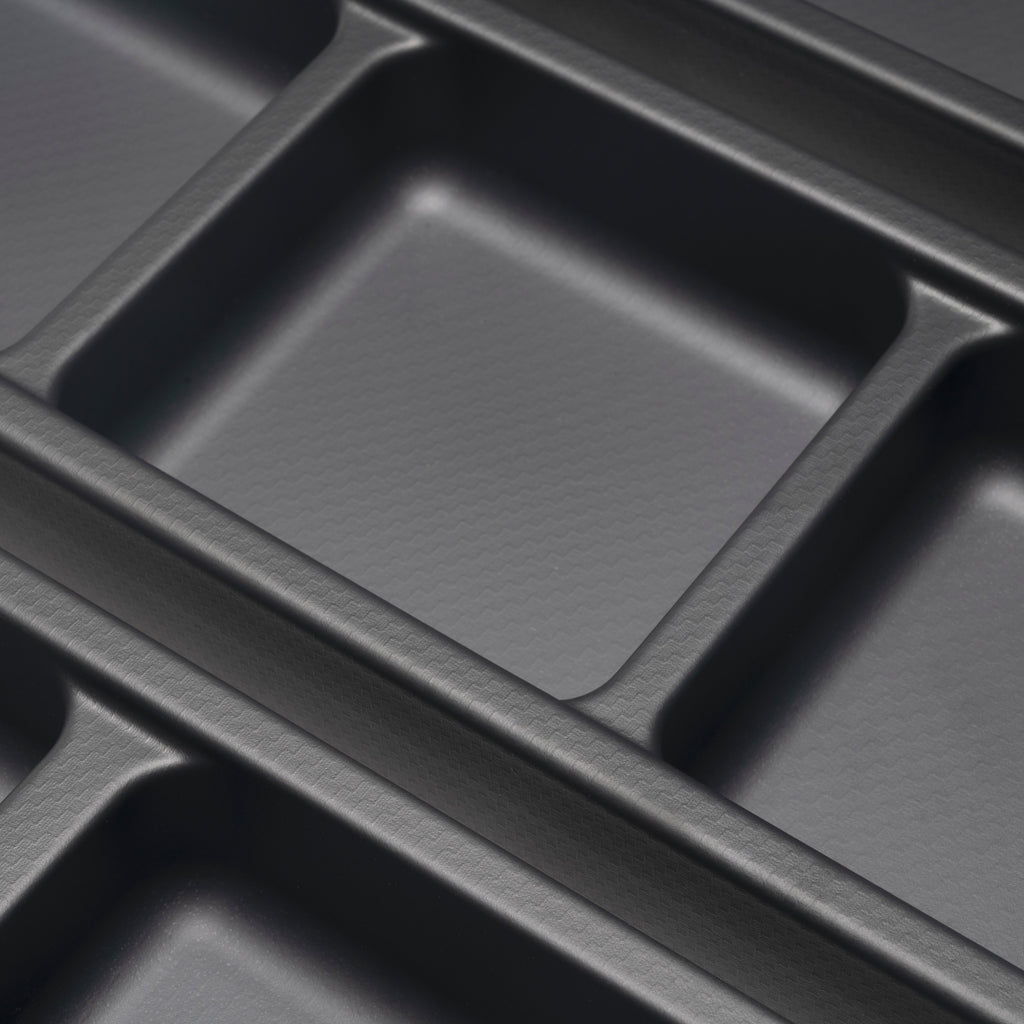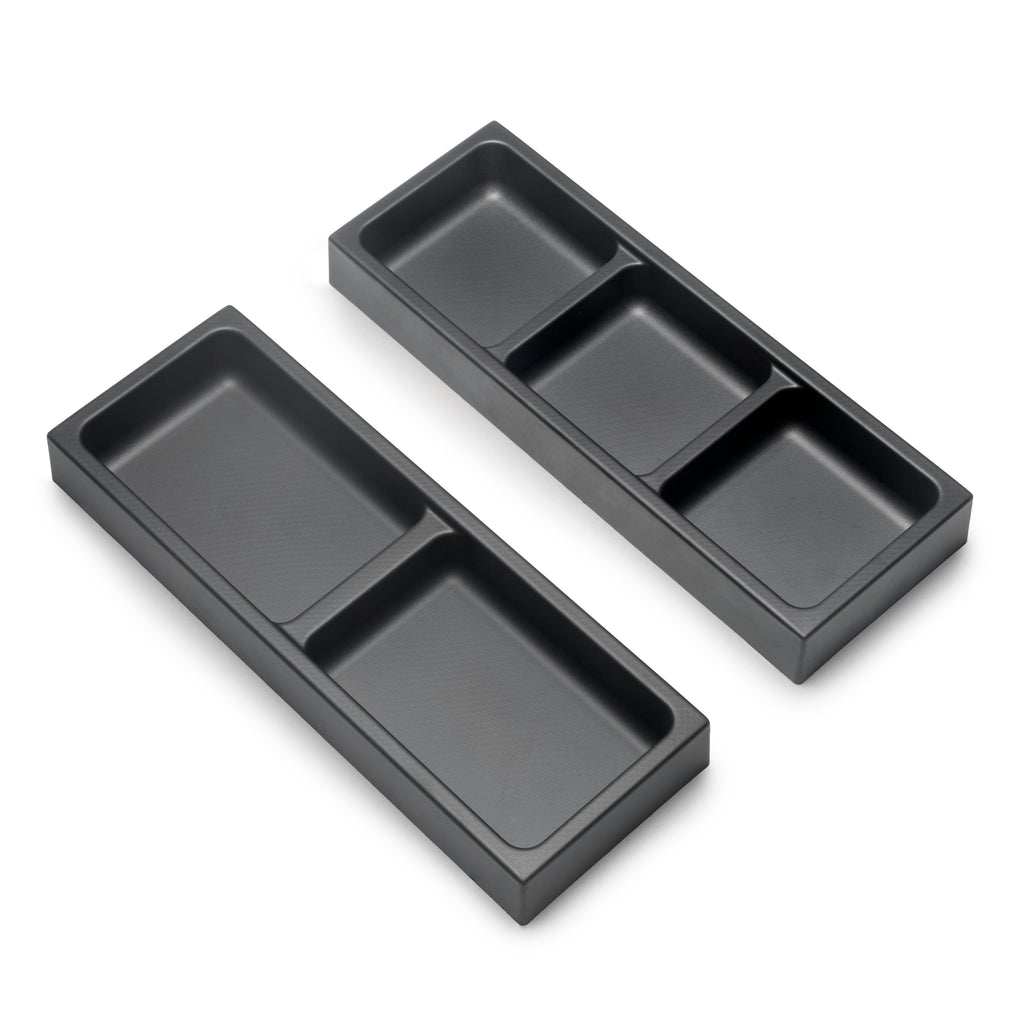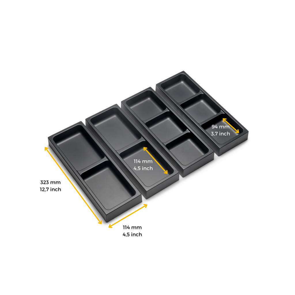 Vengono forniti 4 organizer per cassetti da bagno (2 organizer a 2 fori e 2 organizer a 3 fori). Sono realizzati in plastica ABS, con un'elegante finitura grigio antracite o bianco, colori di tendenza nel design dell'arredo bagno, ideali da abbinare ai cassetti Emuca.
