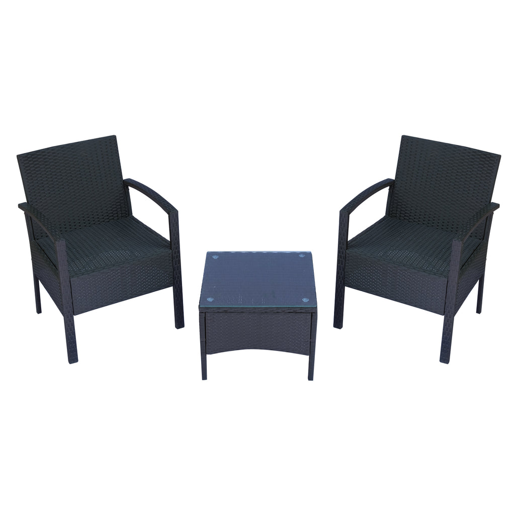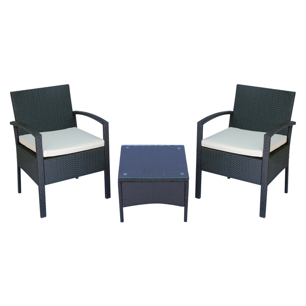 Salon de jardin 2 fauteuils et table basse avec coussins en rotin synthétique noir