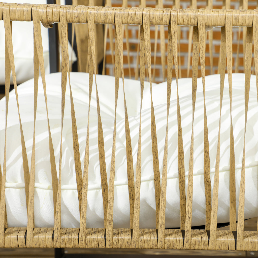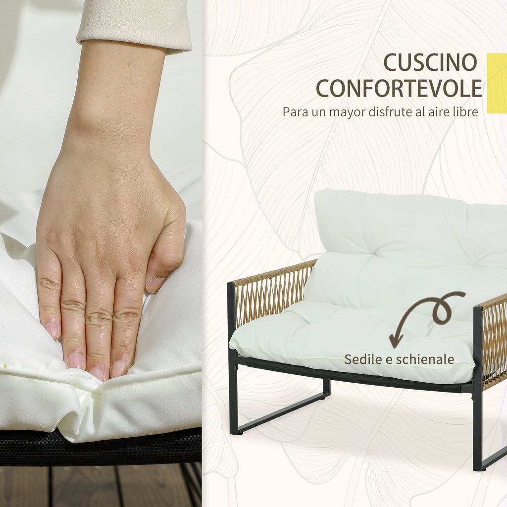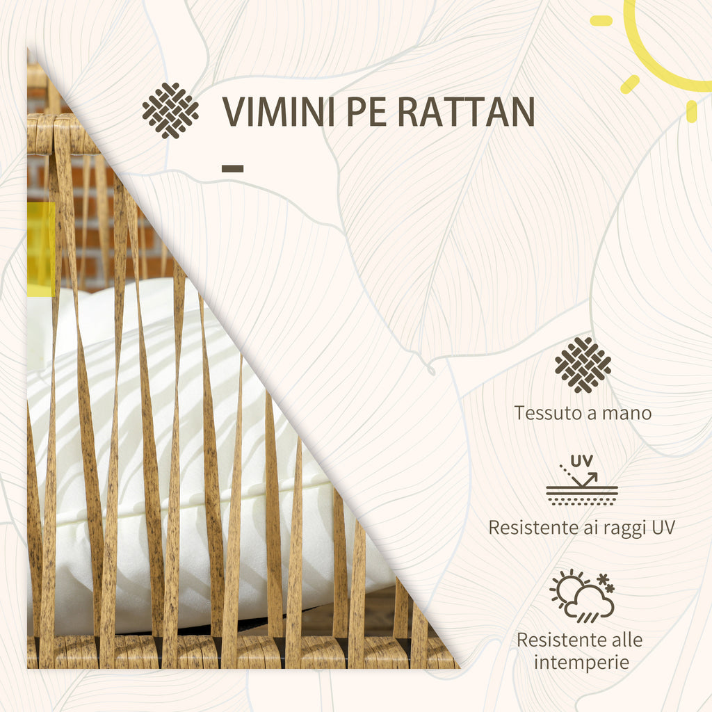 Ravviva il tuo spazio aperto e dona un tocco di stile all'ambiente con questo set da giardino in rattan costituito da un telaio robusto per essere utilizzato tutte le stagioni. Si tratta di un'ottima soluzione di posti a sedere per godersi la terrazza, il patio, il portico, il bordo piscina o il giardino. Decorativo e funzionale, il set da esterno riesce a creare un ambiente invitante per tanti pomeriggi e serate da passare in compagnia. Set da giardino in rattan PE composto da un divanetto, due sedie e un tavolino da caffè con piano in vetro temperato. Struttura in acciaio con verniciatura a polvere per garantire resistenza e durabilità all'aperto. Il rattan PE intrecciato a mano del set da esterno ha il classico aspetto del vimini ed è impermeabile. Il tessuto in poliestere resiste all'acqua e allo sbiadimento. Il tessuto a rete sul retro offre un comfort traspirante. I cuscini comodi del set da esterno possono essere fissati con dei lacci. Piedini regolabili per adattarsi alle superfici irregolari. Facile da montare.