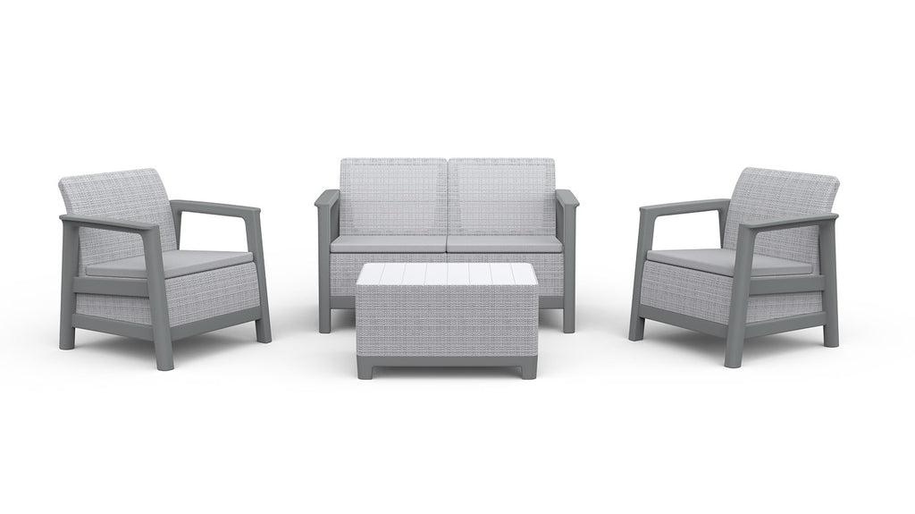 Set Salotto da Giardino 4 Pezzi Divano Poltrone e Tavolino Contenitore Keter Scandi Linea Effetto Juta Grigio Chiaro e Grigio Scuro