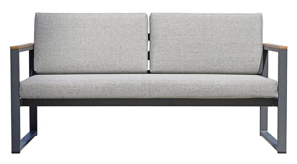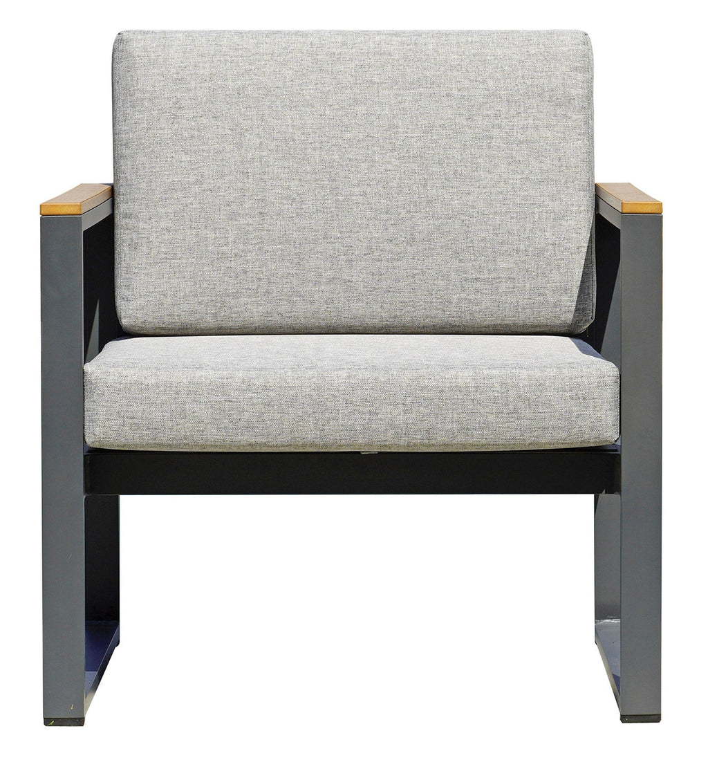 Il set Cerveteri è composto da due poltrone e un divano dalle dimensioni ideali per arredare spazi esterni. Con struttura in alluminio antracite e braccioli in resin wood color teak, il set si completa con un tavolino in ceramic glass effetto ardesia. I cuscini sfoderabili in poliestere grigio chiaro aggiungono comfort e stile al design moderno e raffinato del set.