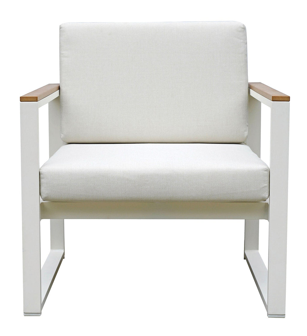 Il set da esterno Cerveteri è composto da due poltrone, un divano e un tavolino con piano in Ceramic Glass effetto cemento. Le dimensioni delle poltrone sono di 75x70x75 cm, mentre il divano misura 162x70x75 cm (LxAxP). La struttura è in alluminio bianco, con braccioli in resina color teak e cuscini sfoderabili in poliestere ecru, ideali per un comfort e stile senza tempo nel giardino o sul terrazzo.
