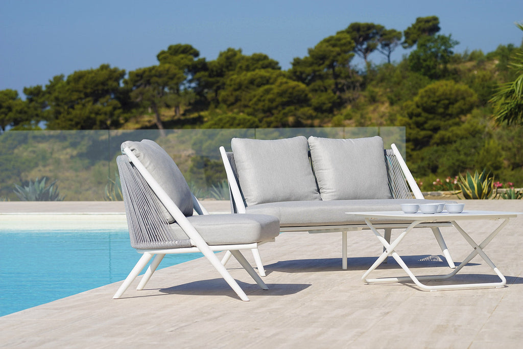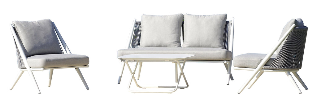 Salon de jardin canapé 2 fauteuils et table basse avec coussins gris clair