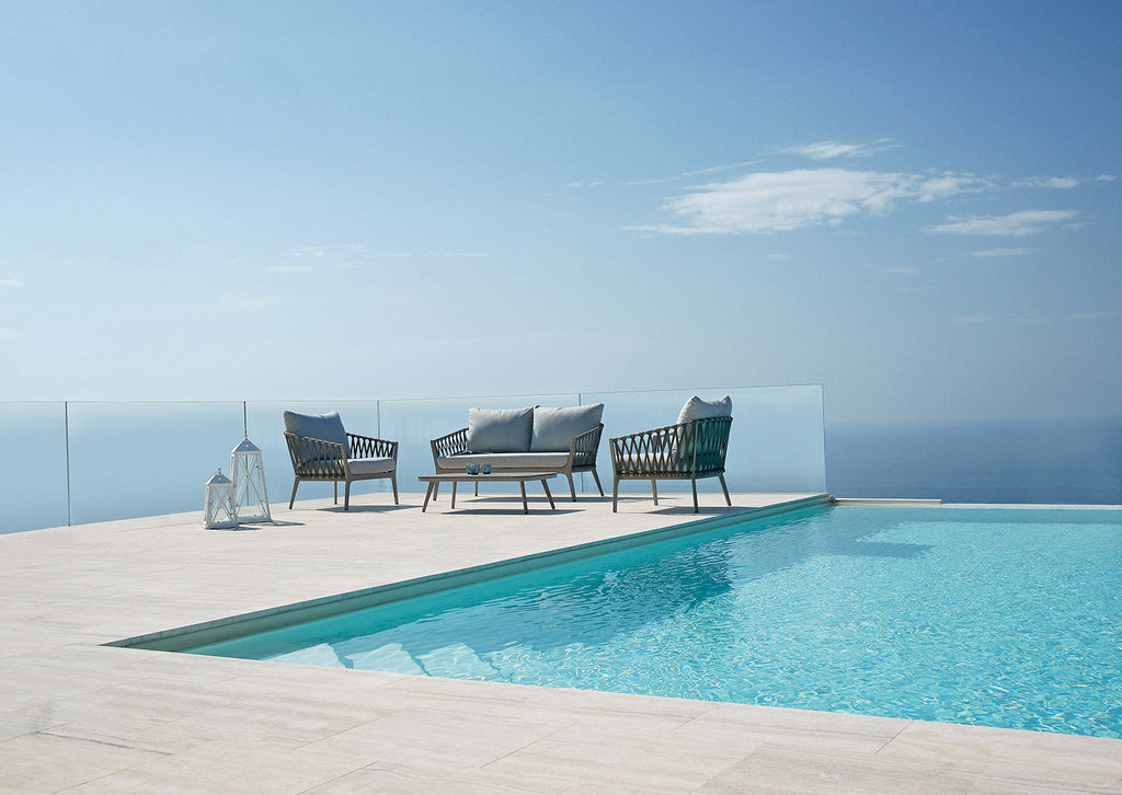 Salon de jardin canapé 2 fauteuils et table basse avec coussins gris clair