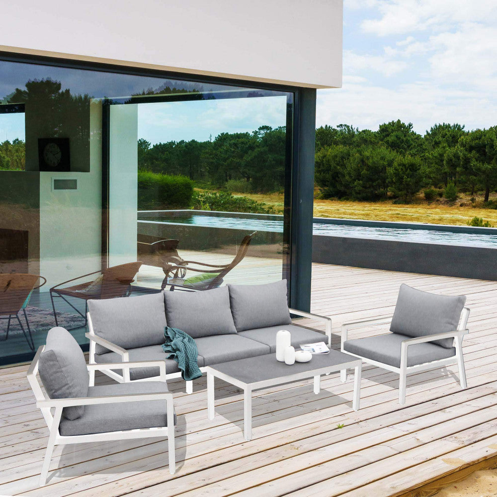 Salon de jardin canapé 2 fauteuils et table basse avec coussins en aluminium blanc