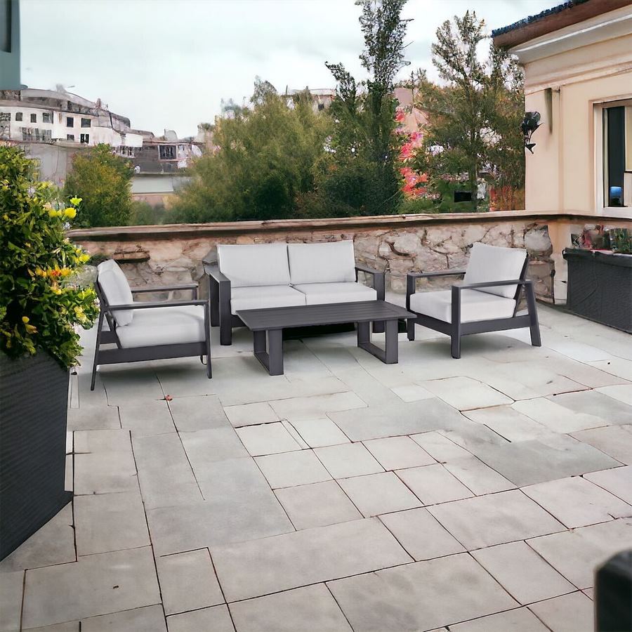 Grazie alla sua robusta struttura in alluminio verniciato a polvere epossidica il set arredo giardino alluminio Bars Grigio è la soluzione ideale per il tuo giardino o terrazzo. Potrai rilassarti e godere dei tuoi spazi esterni senza nessuna preoccupazione, garantendoti una posizione comoda e confortevole grazie alla presenza della cuscineria creata con tessuto olefin (100%polypropylene).Bars Set Alluminio Grigio, grazie alla sua struttura in alluminio e alla particolare lavorazione non si deforma, non arrugginisce e non perde il colore originale col tempo, problema verificato con diversi tipi di prodotti in ferro battuto o delle sedie metallo.