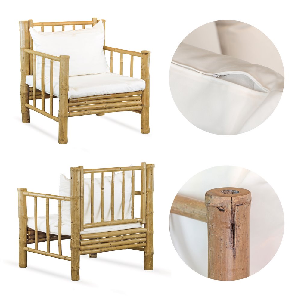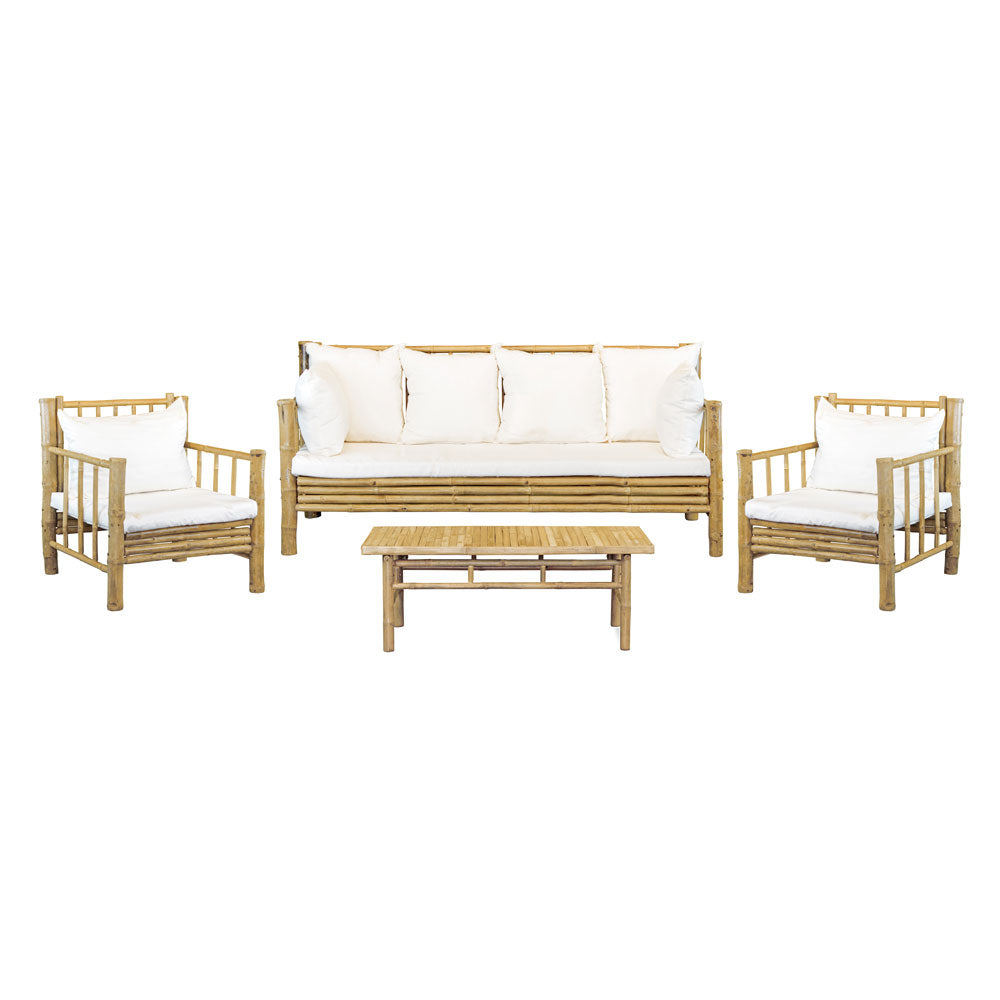Set Salotto da Giardino Divano 2 Poltrone e Tavolino con cuscini in Bambù Yasmin