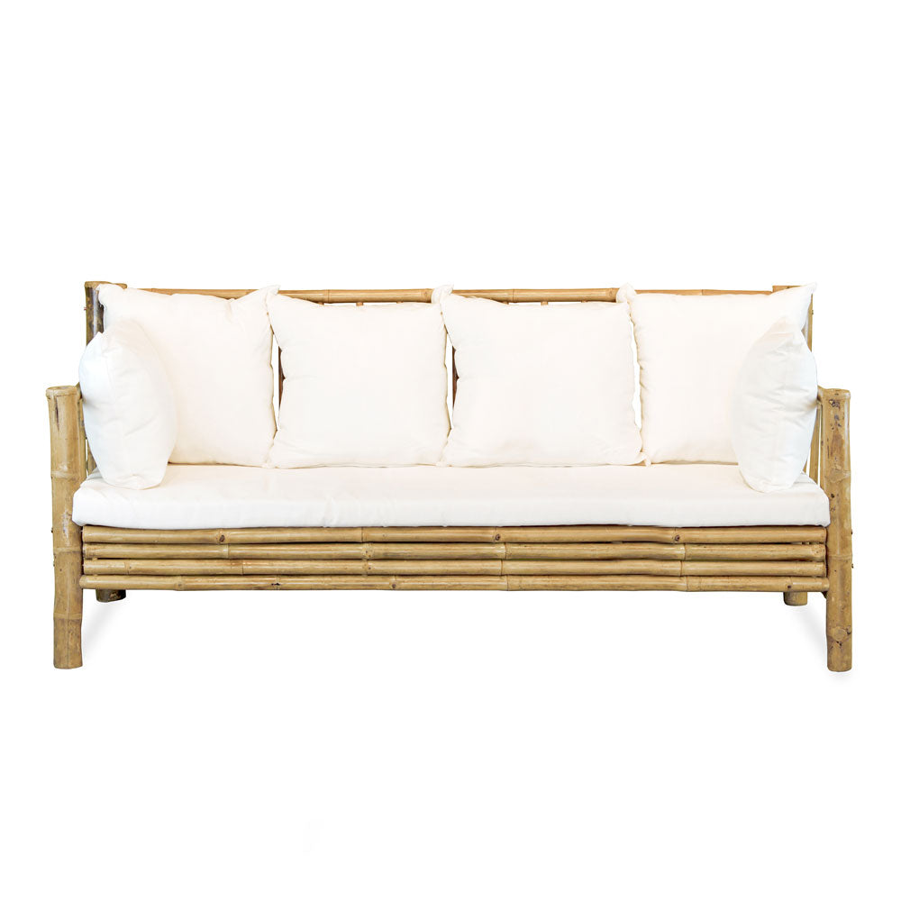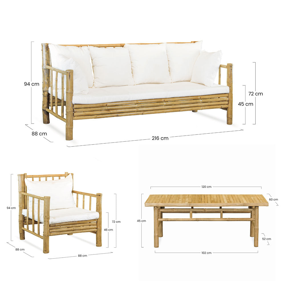 Esalta il tuo spazio outdoor con il nostro esclusivo set in bamboo, un connubio perfetto tra eleganza e funzionalità. Il set con 5 posti comprende un lussuoso divano dalle generose dimensioni 216x88x94 cm due poltrone raffinate di 88x88x94 cm e un tavolino dal design accattivante di 120x60x45 cm. La cuscineria sfoderabile inclusa, dalla tonalità ecrù, aggiunge un tocco di classe e praticità al tuo arredamento.