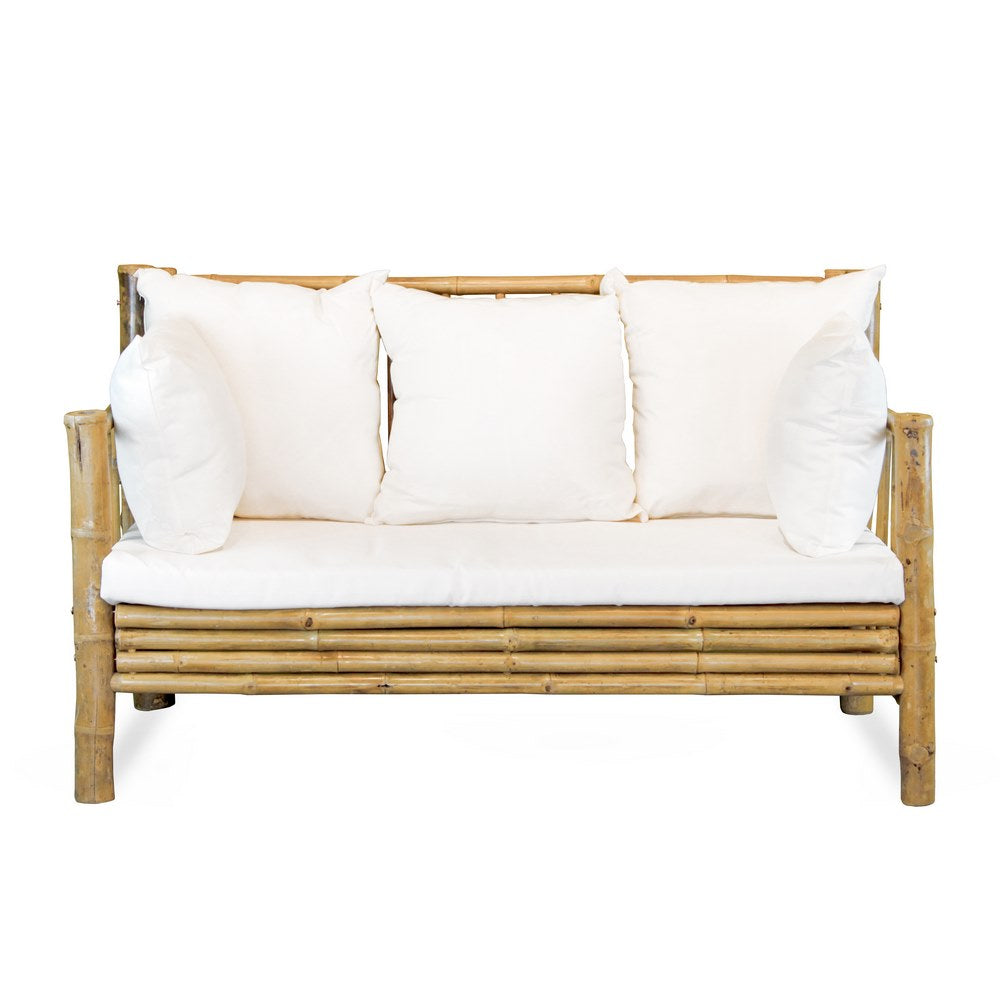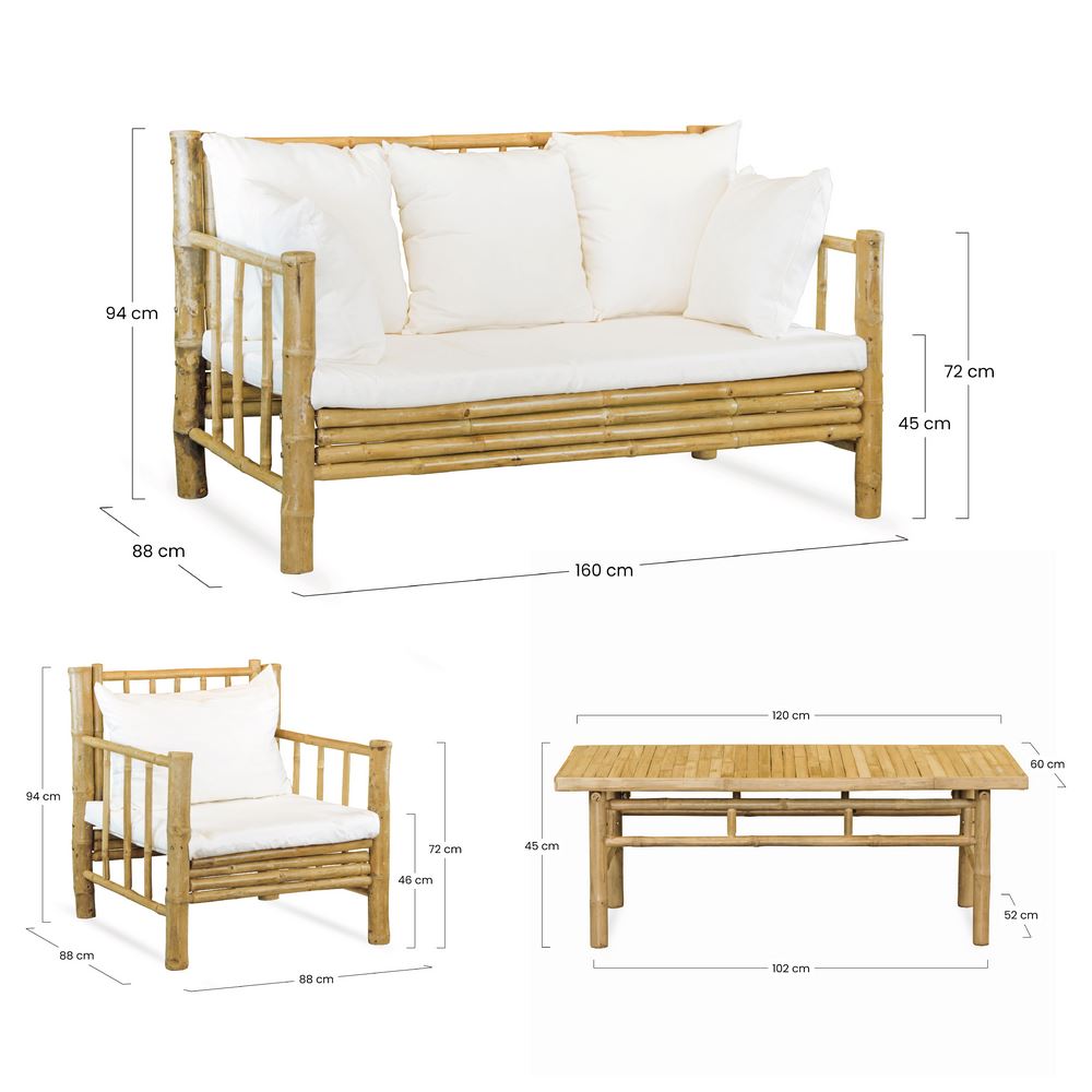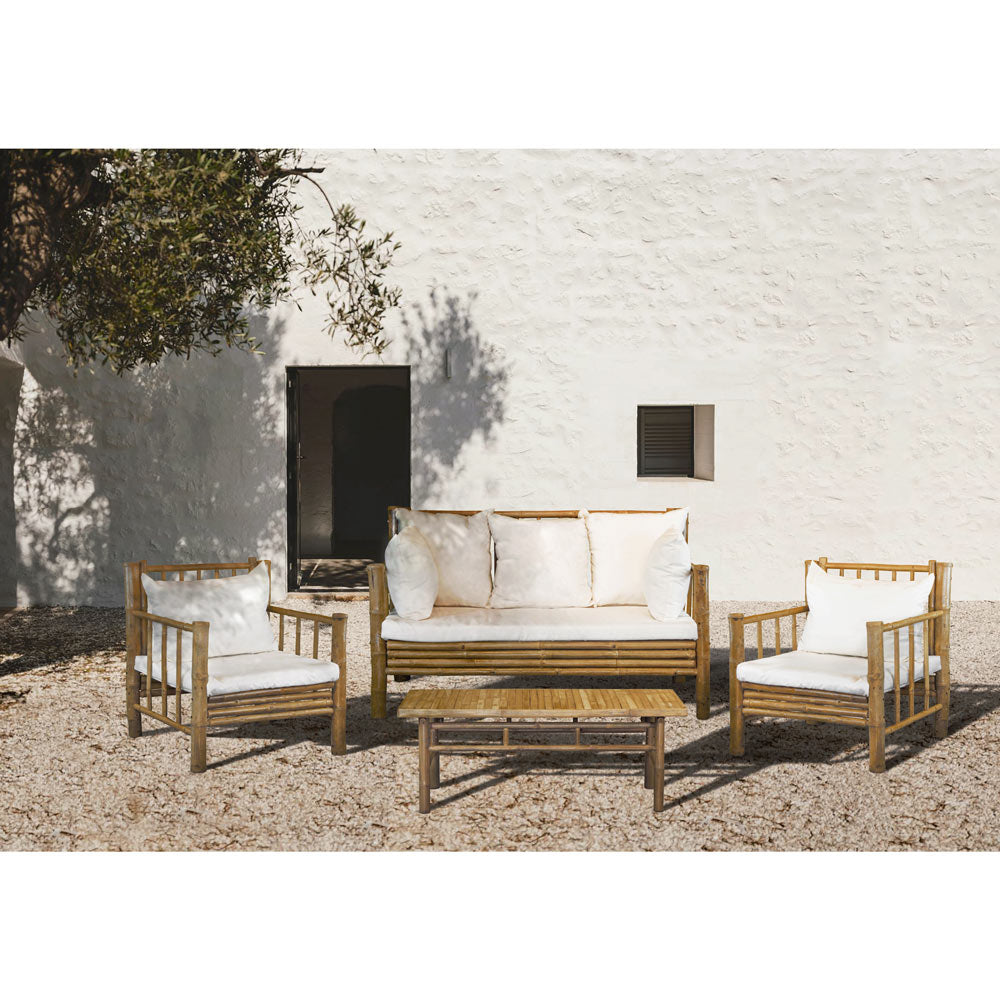 Trasforma il giardino o la terrazza nel luogo ideale per rilassarti, in famiglia o con gli amici, con il nostro set da esterno Yasmin con 4 comodi posti. Realizzato in leggero ma solido legno di bambù di altissima qualità, è composto da una coppia di poltrone, un divano e un tavolino. Tutte le superfici di seduta sono dotate di soffici ma spessi cuscini in color ecrù per una comodità davvero senza pari e per spazi in vero stile rustico.