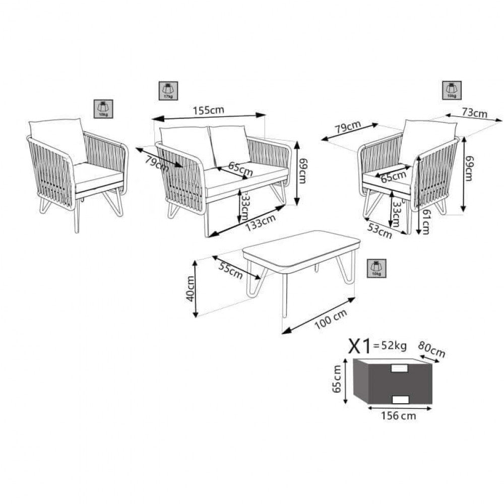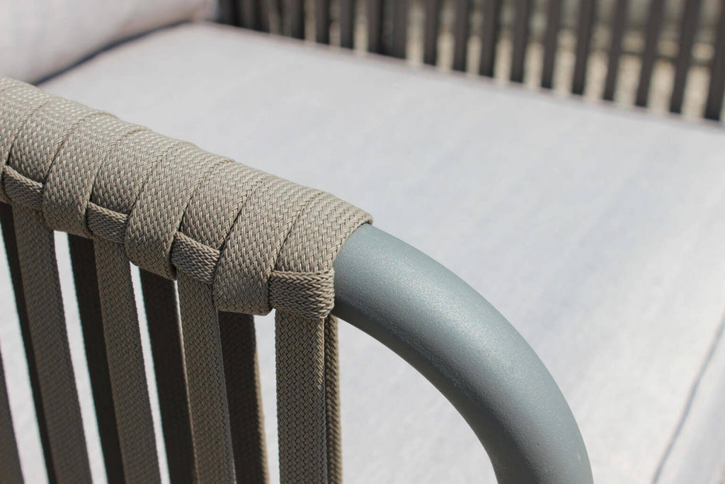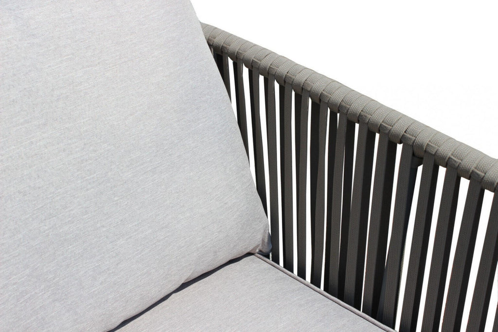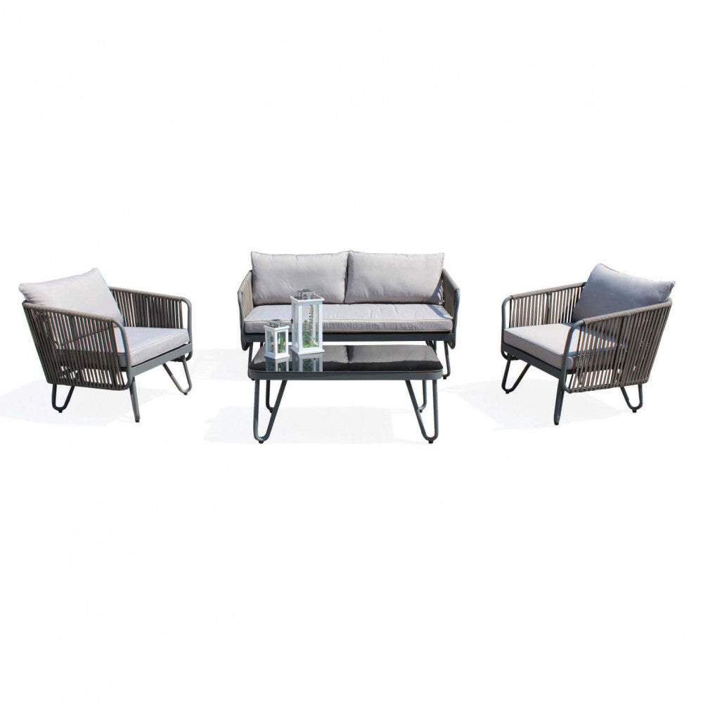 Salon de jardin, canapé, 2 fauteuils et table basse avec coussins en corde taupe