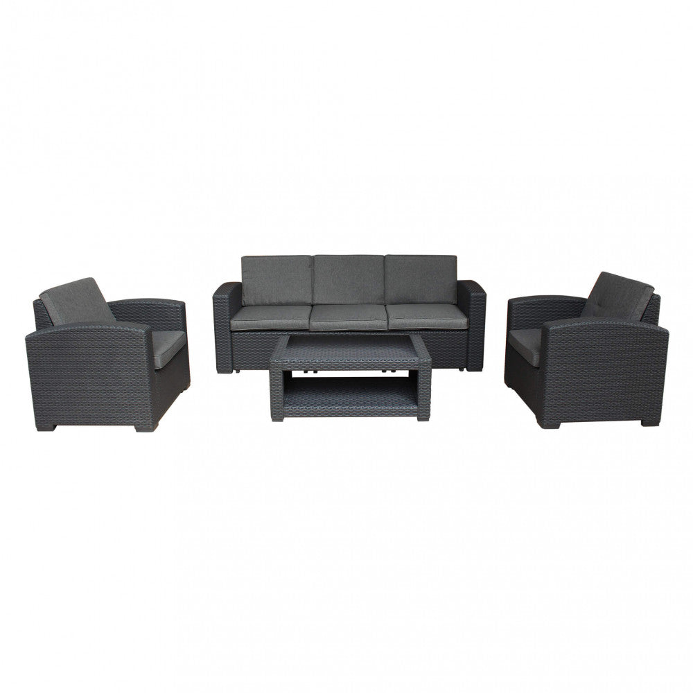 Salon de jardin canapé 2 fauteuils et table basse avec coussins en plastique anthracite