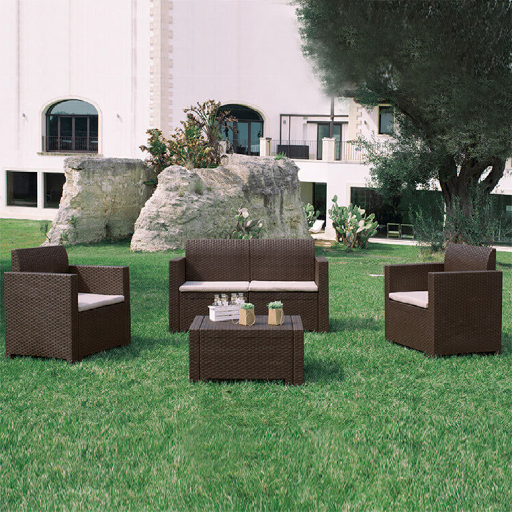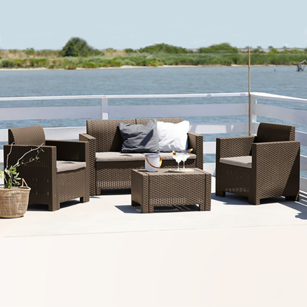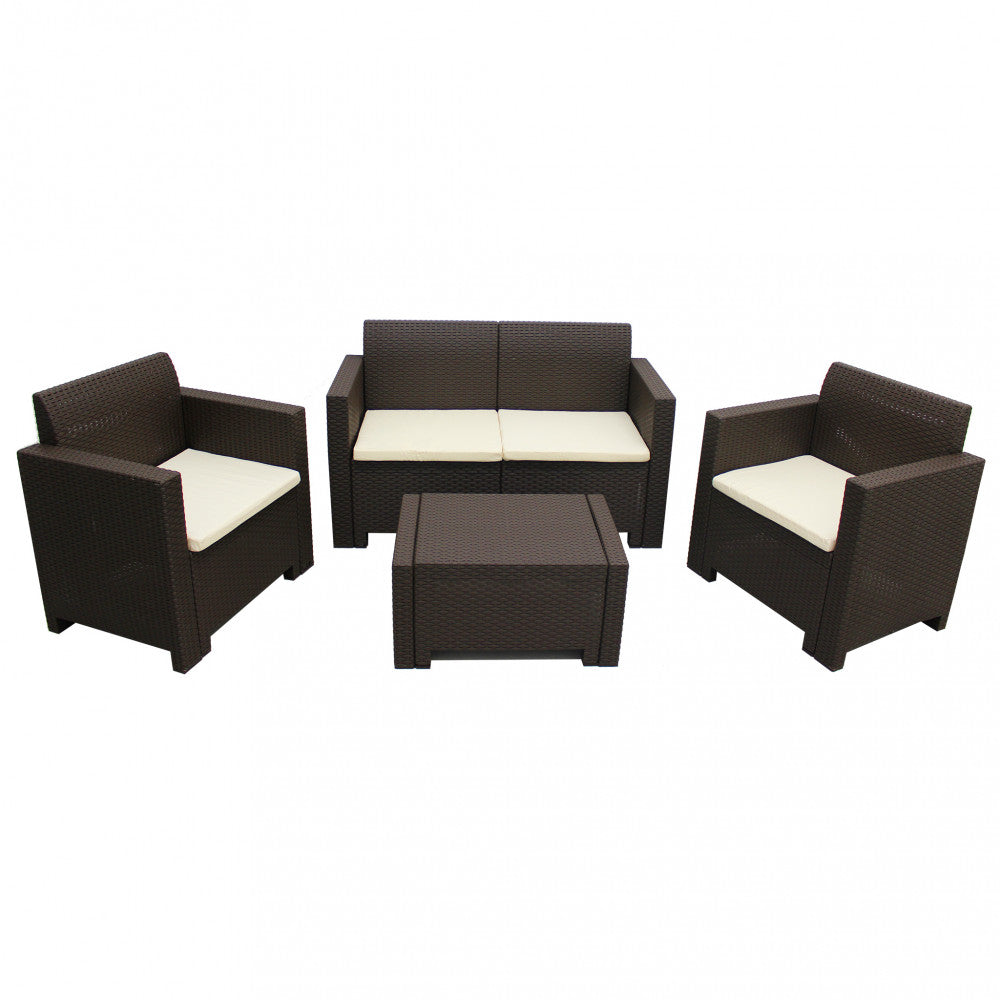 Ensemble salon de jardin canapé 2 fauteuils et table basse avec coussins en plastique marron