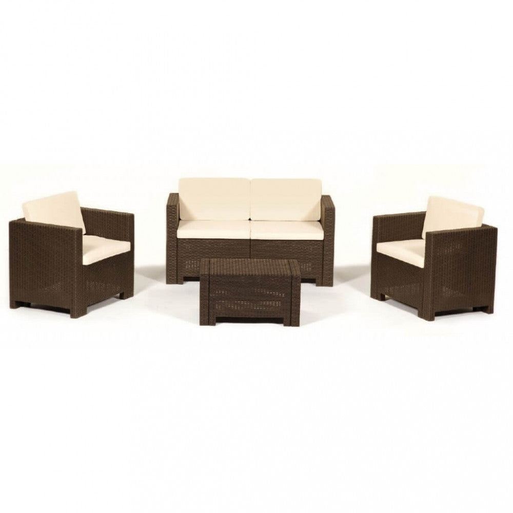 Salon de jardin canapé 2 fauteuils et table basse avec coussins en polypropylène marron