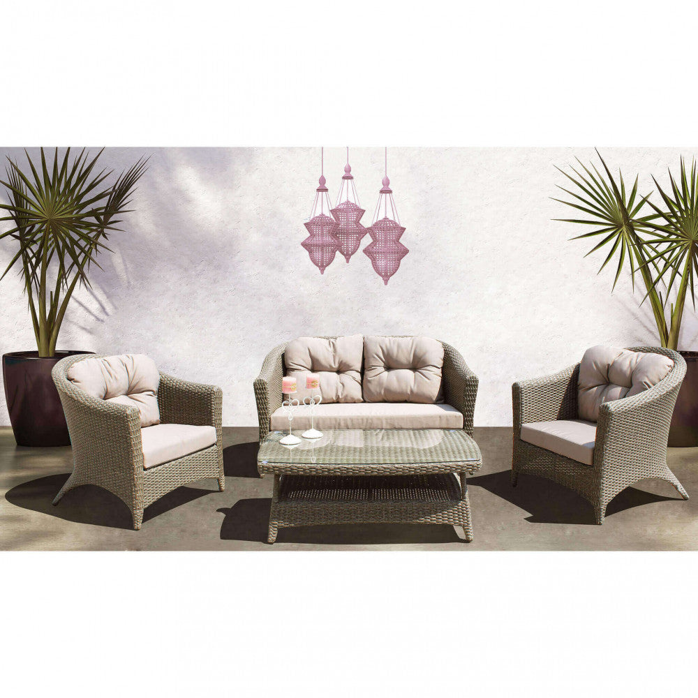 Ensemble salon de jardin canapé 2 fauteuils et table basse avec coussins en osier