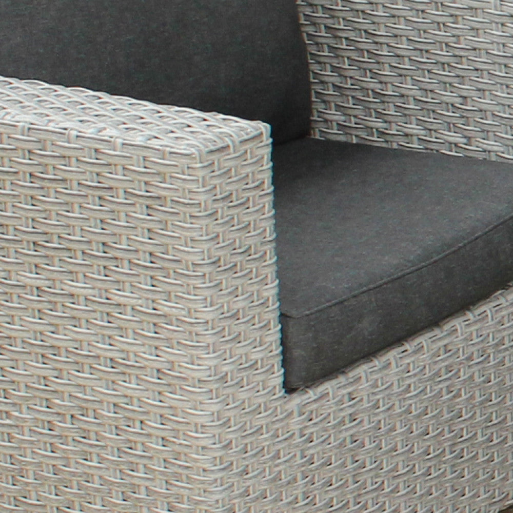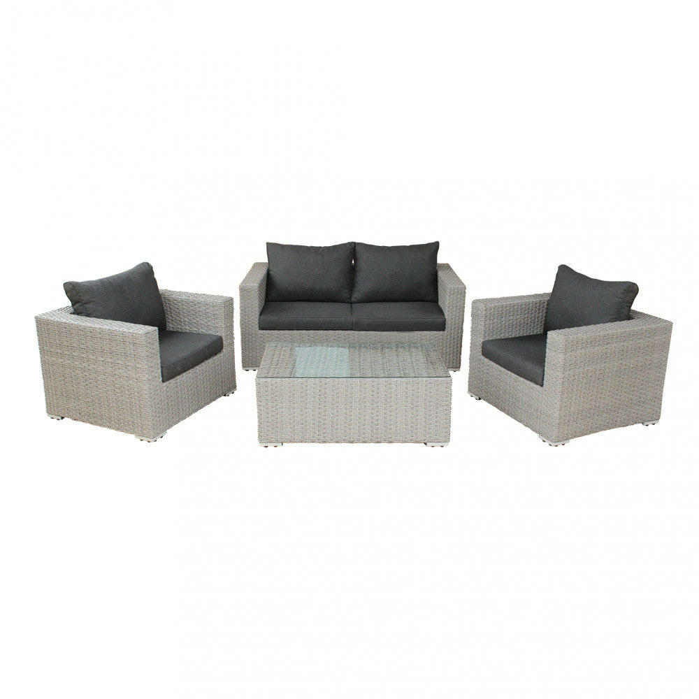Salon de jardin canapé 2 fauteuils et table basse avec coussins en osier gris