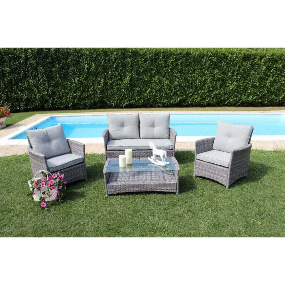 Salon de jardin canapé 2 fauteuils et table basse avec coussins en osier gris