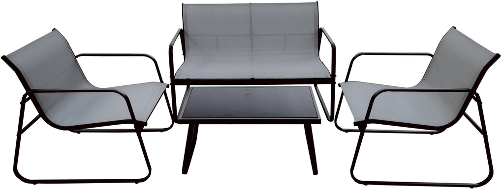 Salottino in acciaio e textilene 2x1 composto da 2 sedie, 1 divano e 1 tavolino rettangolare con top in vetro temperato. Ideale per arredare in modo elegante terrazzi e giardino e anche spazi all'aperto in bar, ristoranti e altre attività ricettive.