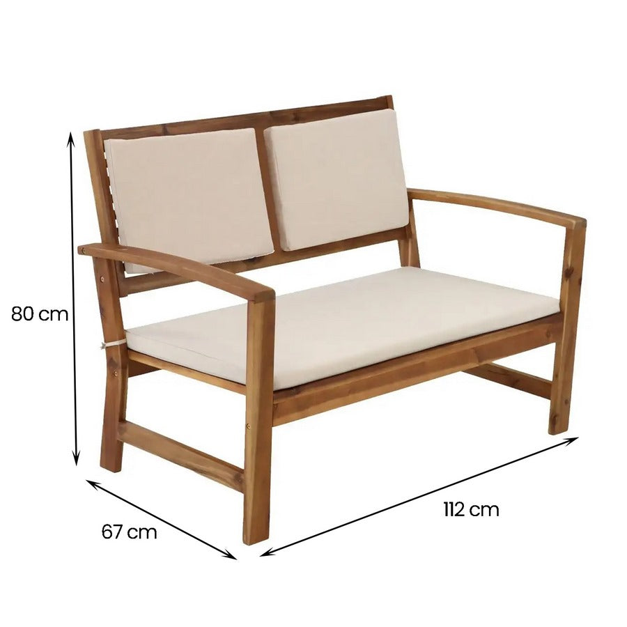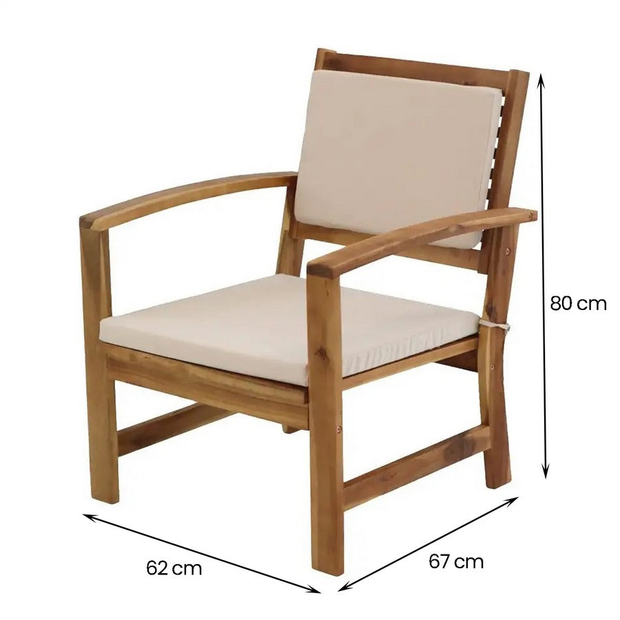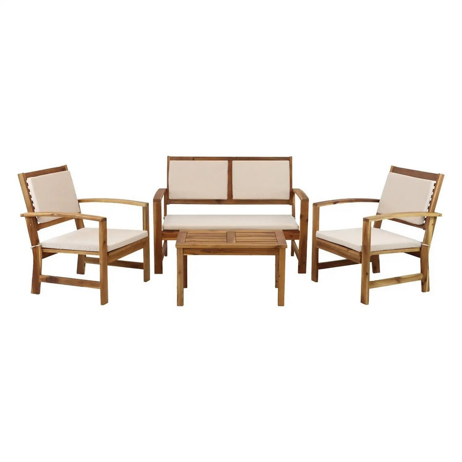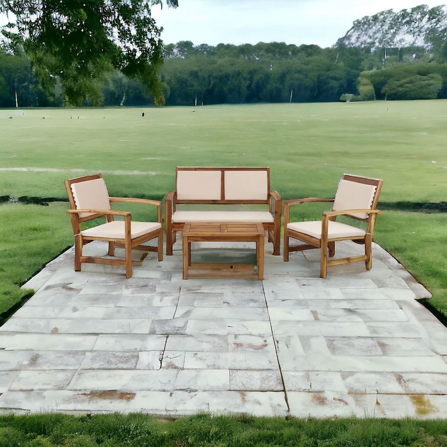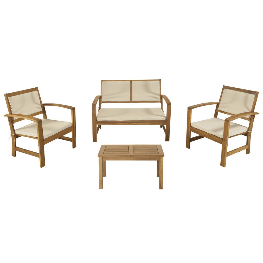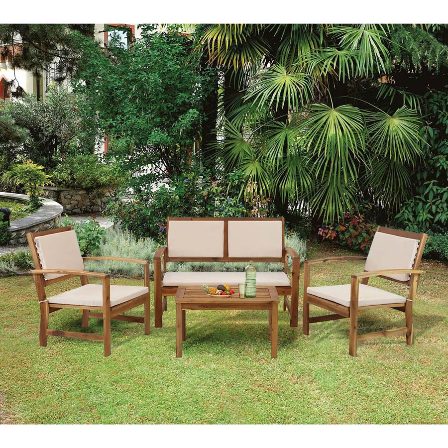 Set Salotto da Giardino Divano 2 Poltrone e Tavolino in Legno con Cuscini Ecrù