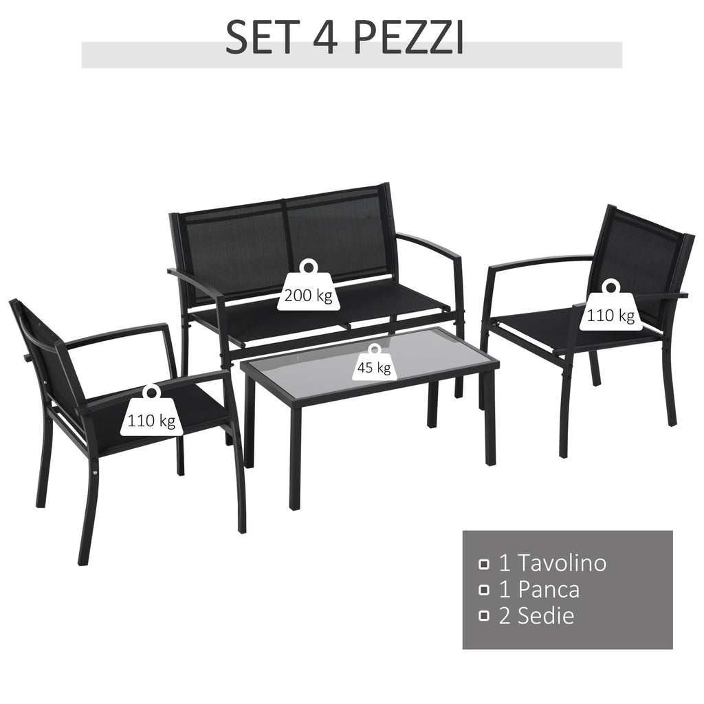 Vous aimez prendre votre petit-déjeuner dans le jardin ? Cet ensemble table et chaises de jardin est parfait pour prendre un café en plein air. Comprend 4 pièces : une table basse, deux chaises et un banc en métal thermolaqué avec une finition noire. Les assises et les dossiers sont en textilène respirant, le matériau parfait pour les chaudes journées d'été.