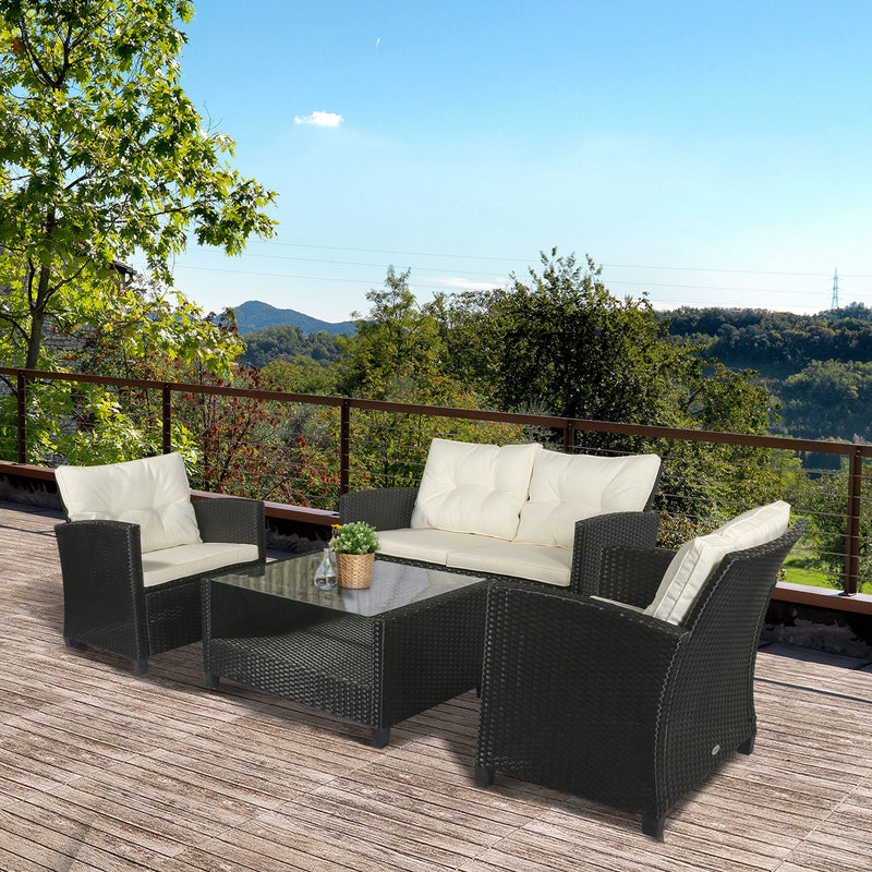 L'ensemble de mobilier en rotin 4 pièces est la solution idéale pour relooker votre décoration de jardin. Il se compose d'un canapé de jardin 2 places, de 2 fauteuils d'extérieur et d'une table basse en rotin, que vous pourrez composer à votre guise pour les utiliser tous ensemble ou séparément. La table a un design élégant avec un plateau en verre trempé et une étagère inférieure. Le cadre stable en métal et rotin PE du meuble assure une longue durée de vie et une résistance aux intempéries.