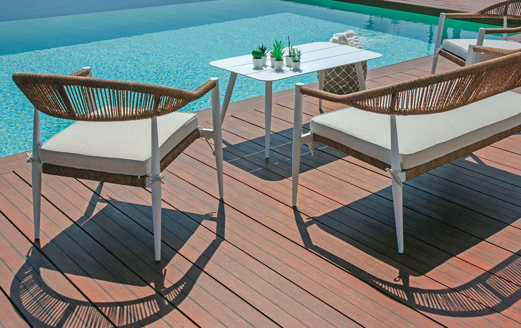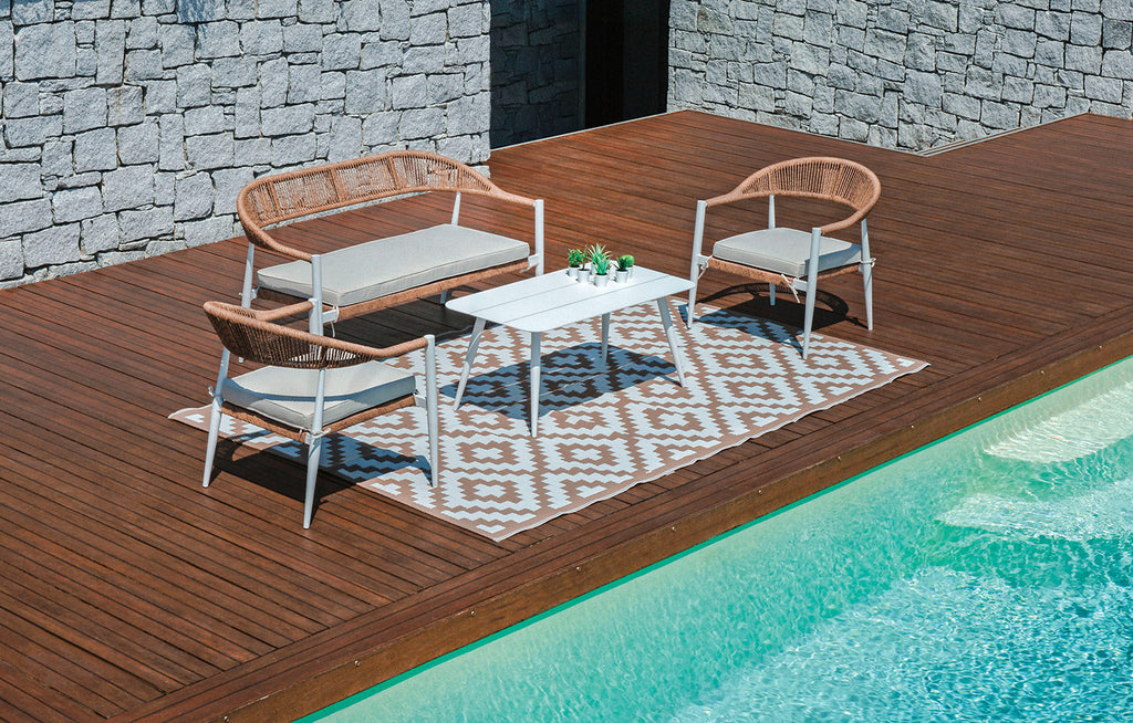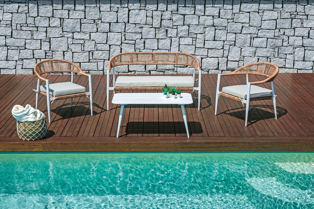 Il set Milano è composto da due poltrone, un divano e un tavolino, ideale per arredare con stile il tuo spazio esterno. Le dimensioni delle poltrone sono 67x76x70 cm, mentre per il divano sono 137x76x70 cm. Il tavolino, con piano a doghe di alluminio, misura 100x45x55 cm. La struttura in alluminio bianco B, il twist wicker Ø 5 mm paglia e i cuscini sfoderabili color ecru completano questo elegante set da giardino.