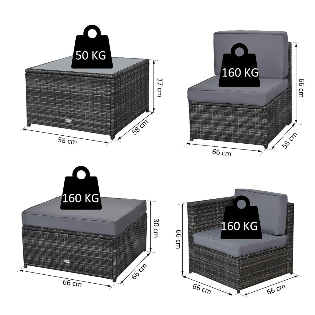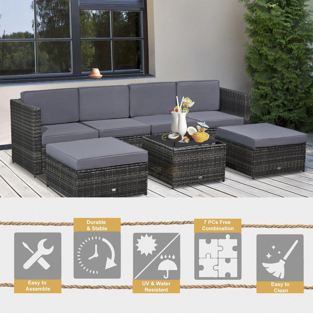 - ENSEMBLE 7 PIÈCES : Ce salon d'extérieur en rotin apportera une touche d'élégance à votre jardin ! L'ensemble se compose de 2 fauteuils sans accoudoirs, 2 fauteuils d'angle, 2 repose-pieds et 1 table basse.
