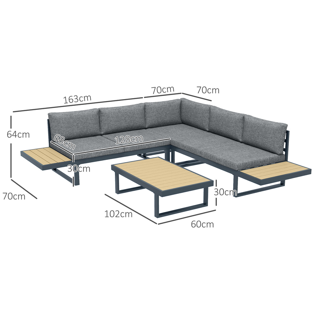 Trasforma il tuo spazio esterno in un'oasi di relax con l'elegante set da giardino da 4 pezzi. Il set è composto da due accoglienti divanetti laterali, una poltrona angolare e un tavolino da caffè accogliente, tutti completi di cuscini lavabili. La struttura in alluminio è progettata per resistere efficacemente nei grandi spazi aperti, mentre il tessuto in fibra corta resistente agli schizzi e i dettagli in legno composito in tonalità teak donano uno stile moderno e naturale al set.