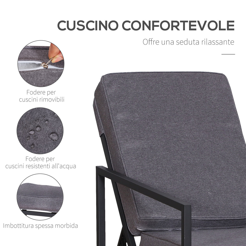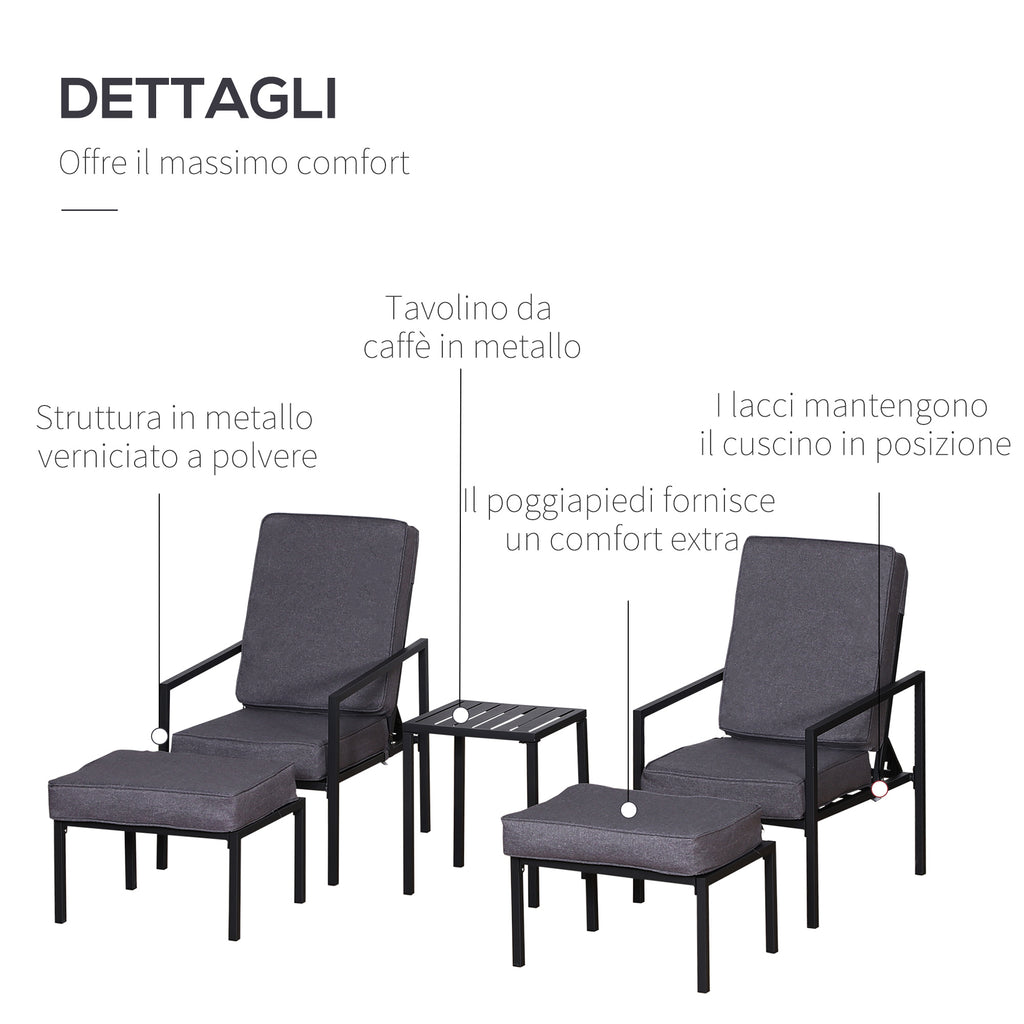 Salon de jardin en métal et polyester 2 chaises 2 poufs et table basse grise et noire