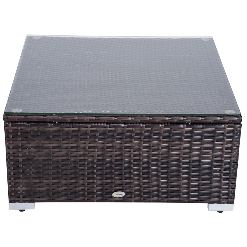 L'ensemble comprend 4 fauteuils, 1 pouf, 1 table basse avec plateau en verre trempé de 5 mm et 2 coussins.