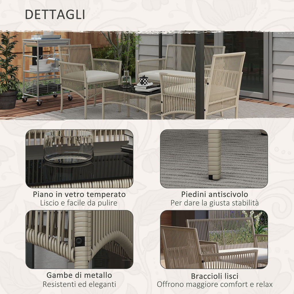 Rinnova il tuo giardino e rendi l'esterno dei tuoi spazi invitante e accogliente. Questo set da giardino è composto da 4 pezzi e realizzato con una robusta struttura in acciaio e vimini in rattan PE per essere utilizzato tutte le stagioni. Decorativi e funzionali, il set da esterno creano un ambiente per terrazzo, patio e veranda, in modo da lasciarti immergere nel relax e in piacevoli pomeriggi in compagnia.