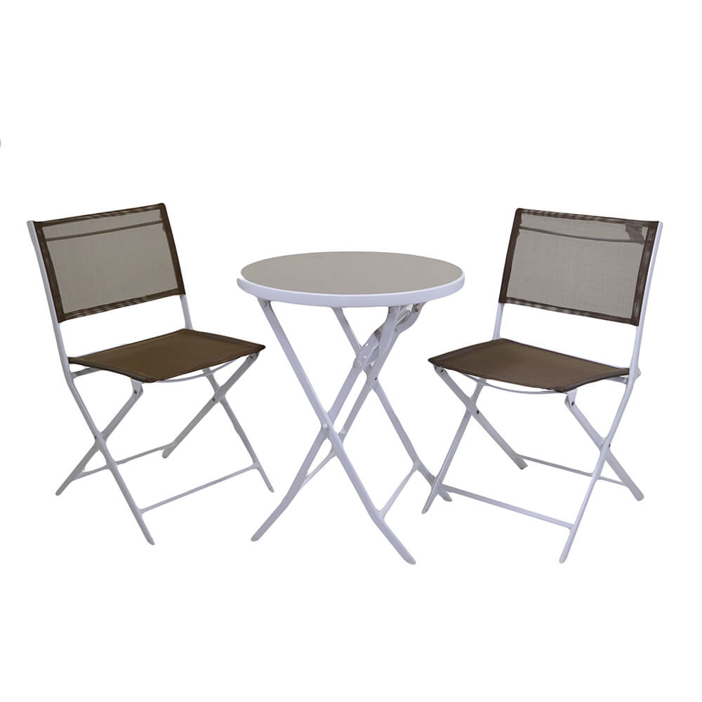 Salon de Jardin avec Table Basse Ronde et 2 Chaises Pliantes en Métal Taupe et Textilène