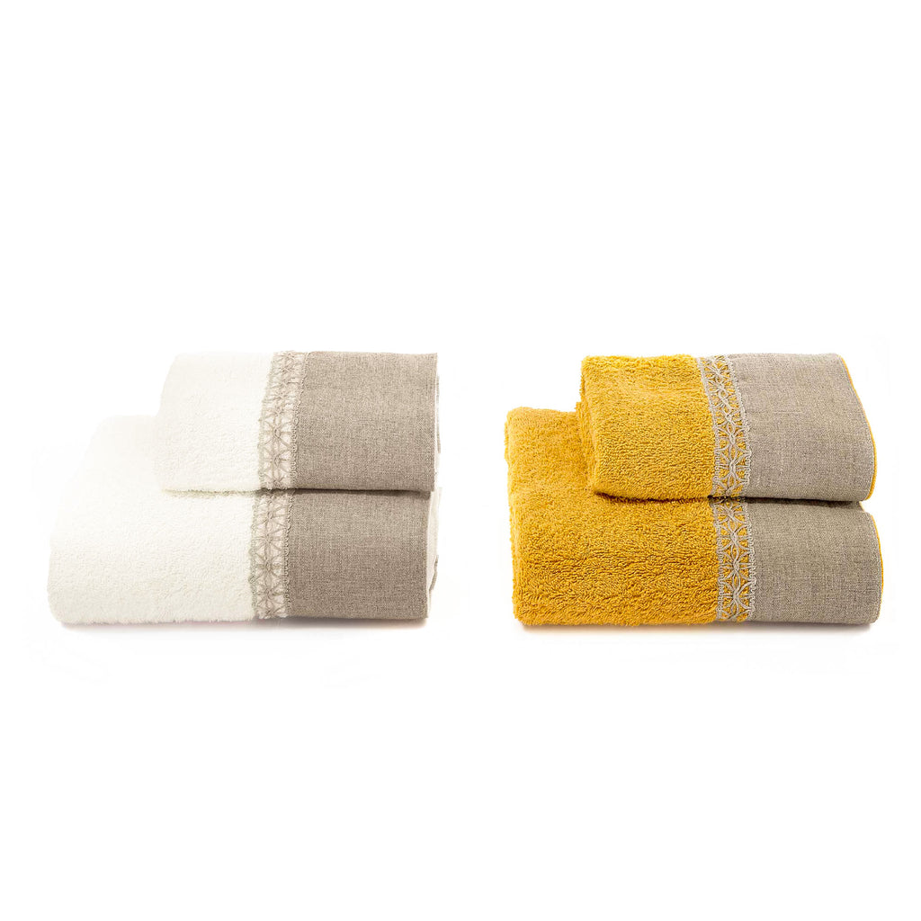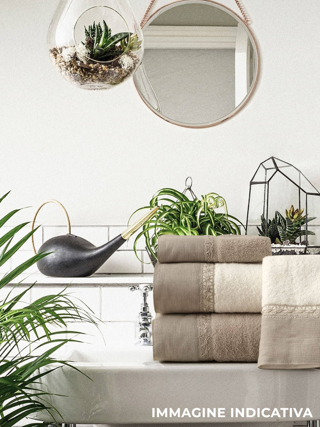 2 serviettes visage + 2 serviettes invités en éponge pur coton 430 g/m2 avec volant et dentelle de lin. Tous les articles de l'ensemble sont fabriqués et emballés en Italie selon la tradition textile artisanale toscane.