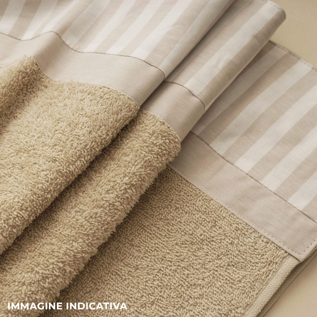 2 serviettes visage + 2 serviettes invité en éponge pur coton 430 g agrémentées d'un volant pur coton teint en fil, rayure moyenne. Tous les articles de l'ensemble sont fabriqués et emballés en Italie selon la tradition textile artisanale toscane.