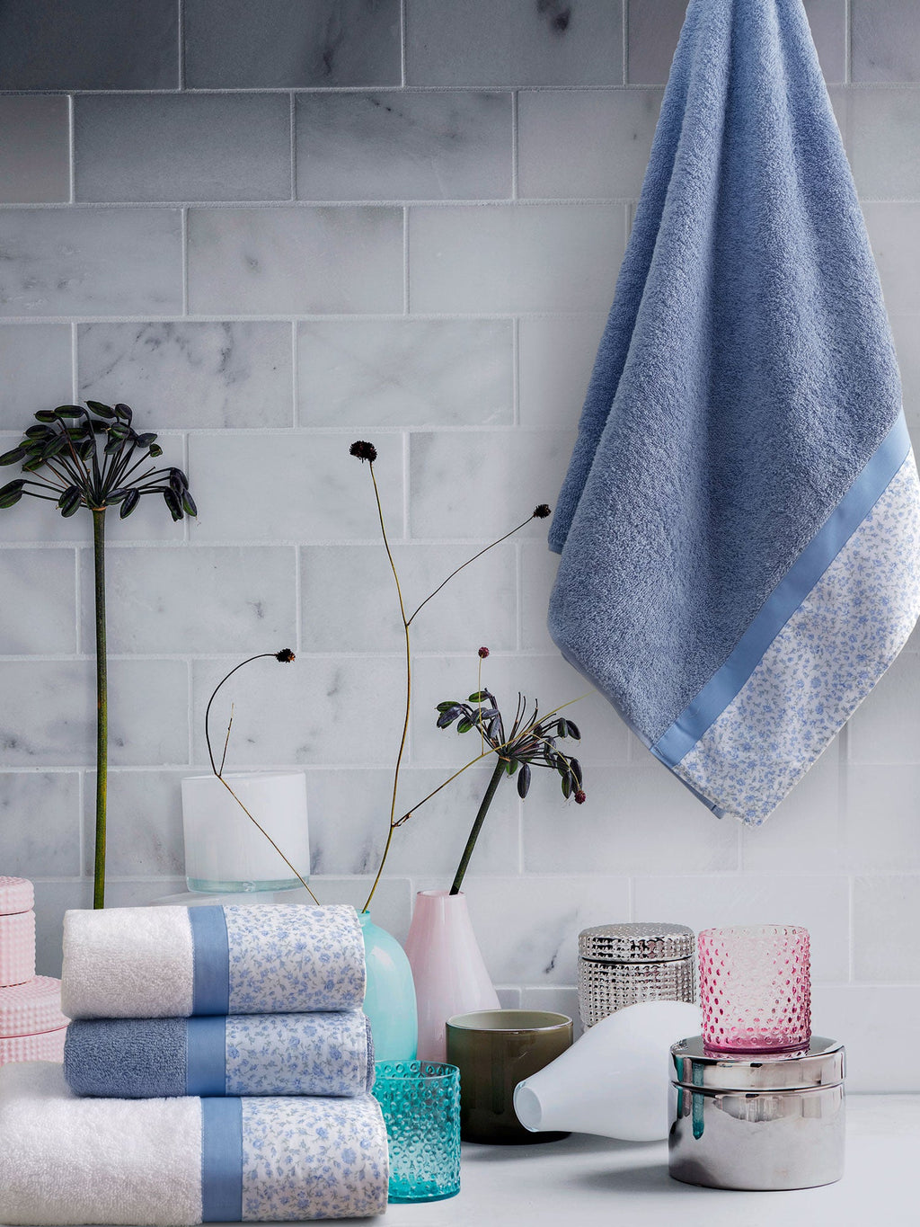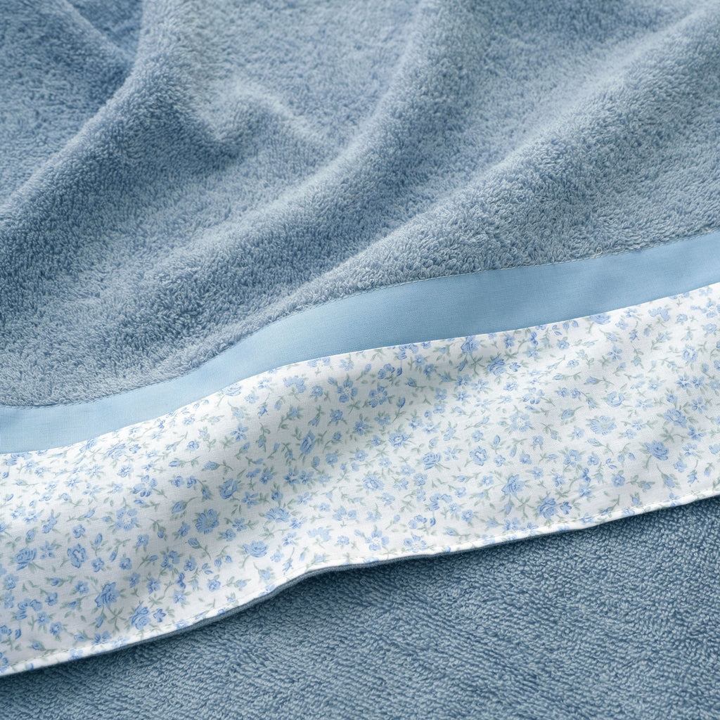 2 serviettes visage + 2 serviettes invité en pur coton éponge 430 g agrémenté d'un volant en percale imprimée. Tous les articles de l'ensemble sont fabriqués et emballés en Italie selon la tradition textile artisanale toscane.
