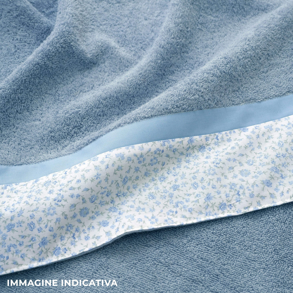 2 serviettes visage + 2 serviettes invité en pur coton éponge 430 g agrémenté d'un volant en percale imprimée. Tous les articles de l'ensemble sont fabriqués et emballés en Italie selon la tradition textile artisanale toscane.