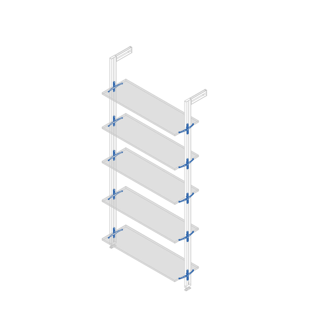 Lot de 5 jeux de supports en zamak pour étagère en verre. L'assemblage s'effectue sur le profilé composant ainsi la structure modulaire Zero de votre choix.