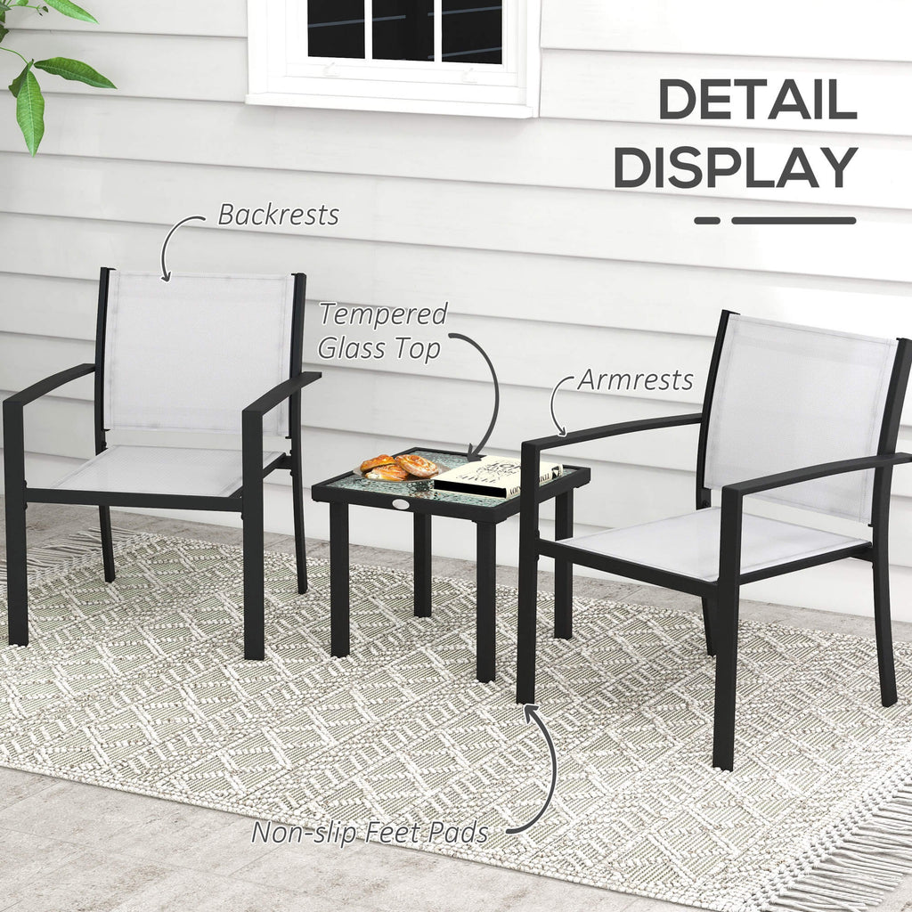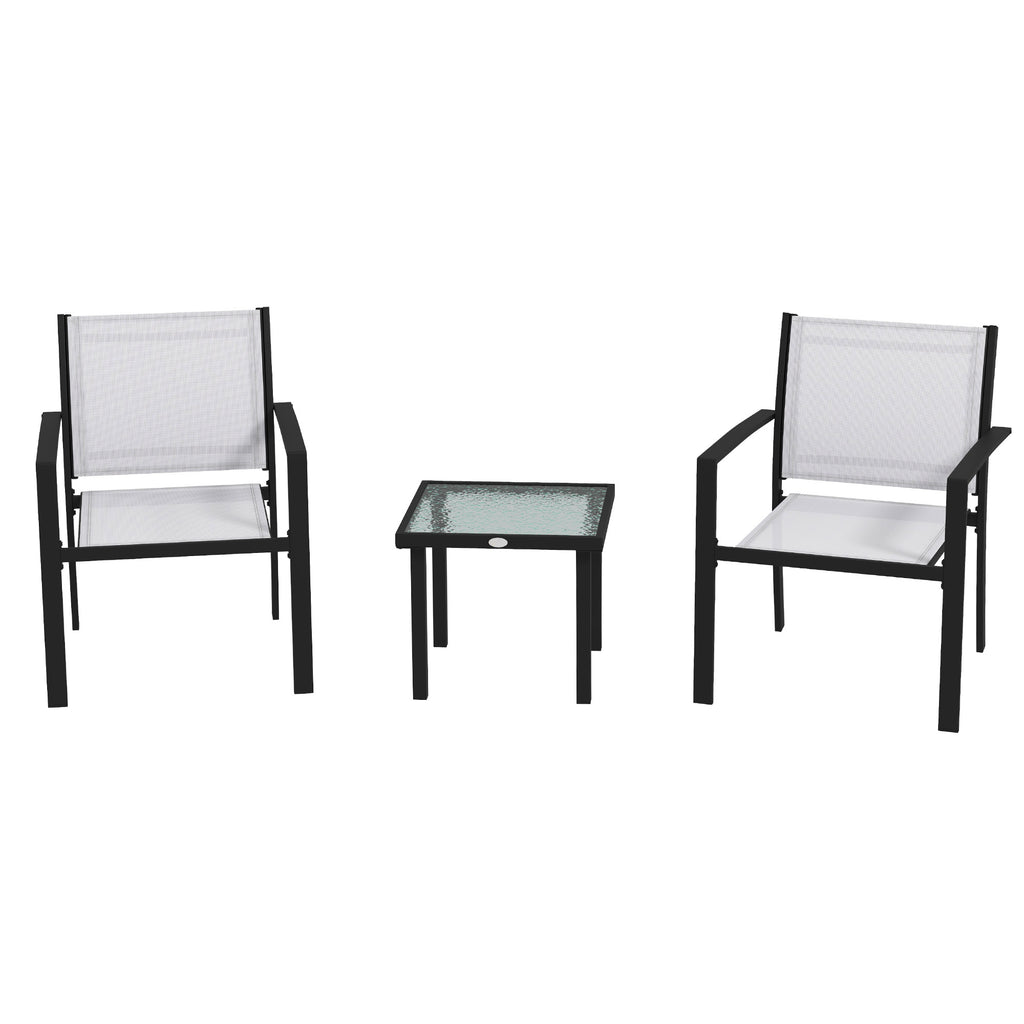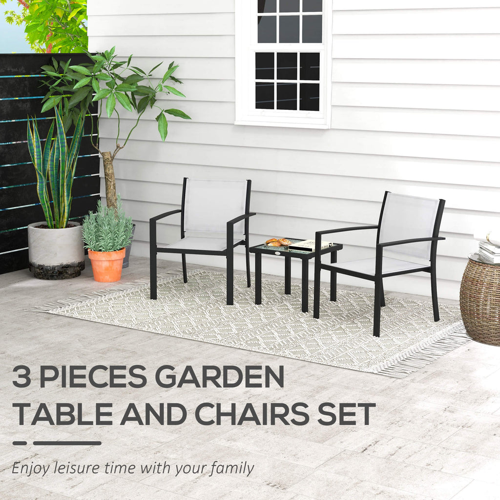 Set Tavolino con Piano in Vetro e 2 Sedie Impilabili da Giardino in Acciaio e Tessuto Grigio Chiaro