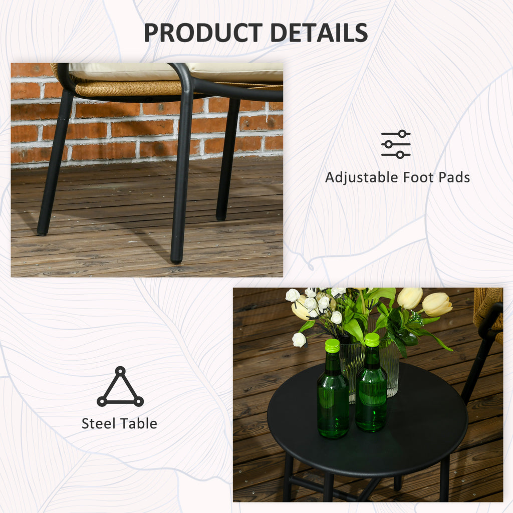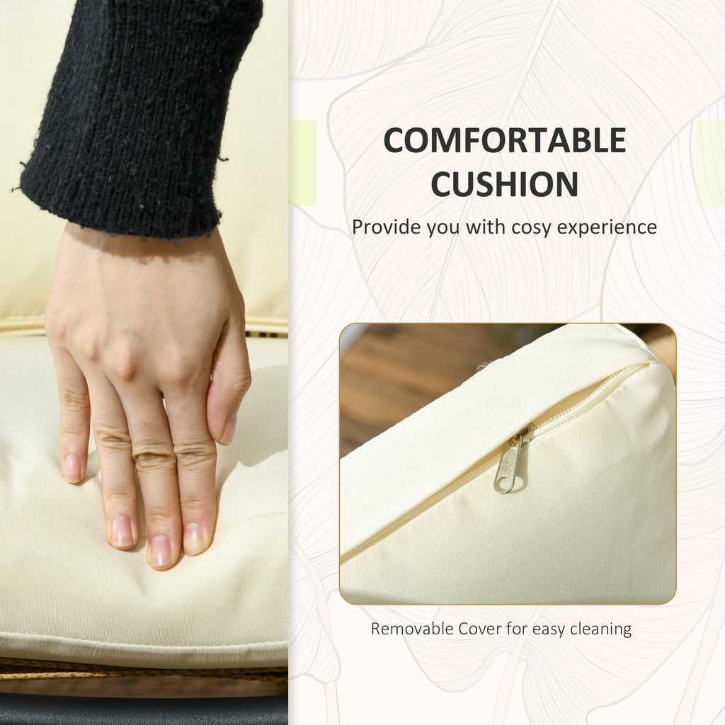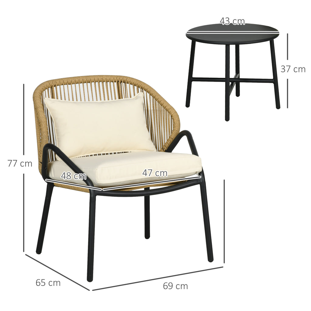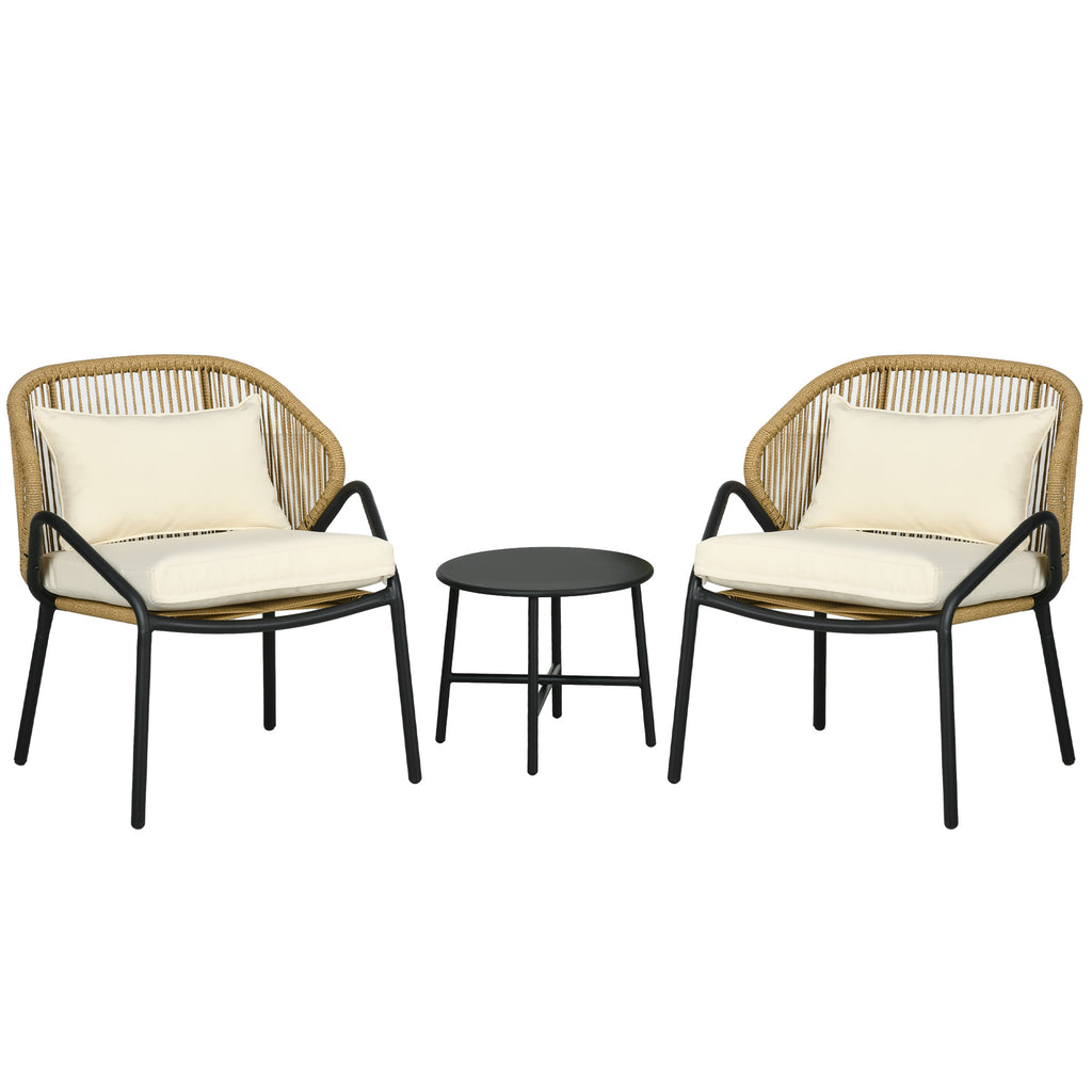 Set Tavolino e 2 Poltrone da Giardino con Braccioli e Cuscini in Acciaio e Rattan PE Crema