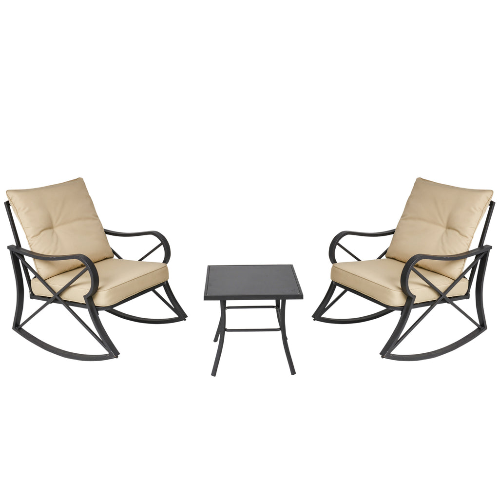 Ensemble Table Basse et 2 Chaises à Bascule de Jardin avec Coussins en Acier Marron