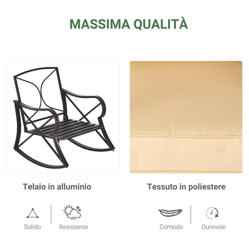 L'ensemble chaise berçante et table de jardin est prêt à vous détendre dans votre espace de vie extérieur. La structure en acier et le revêtement en polyester des coussins sont de haute qualité, pour vous offrir résistance et longévité. La table de jardin a un élégant plateau en verre trempé et les chaises à bascule ont des coussins moelleux sur le dossier et le siège. Votre décoration de jardin ne sera pas complète tant que vous n'aurez pas cet ensemble élégant, ne le manquez pas !