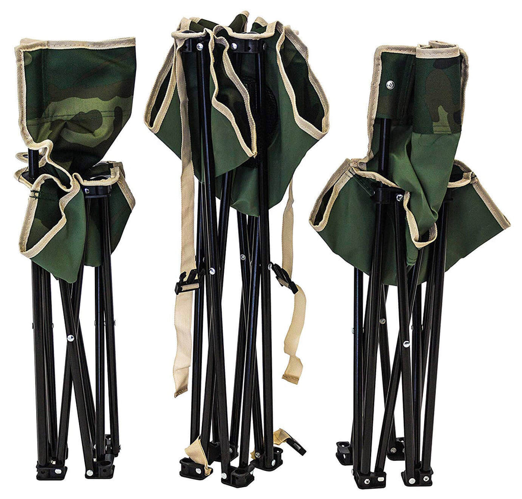 Le dossier et l'assise sont adaptés pour accueillir une charge maximale de 100 kg. La poignée pratique du sac, également avec un motif camouflage, permet de porter l'ensemble à l'épaule ou à la main, comme s'il s'agissait d'une mallette.