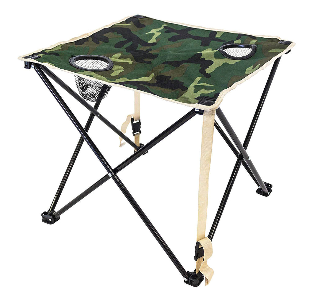Le tissu Oxford camouflage 600D est lavable à l'eau et au savon. La table est équipée de 2 poches filet pratiques pour insérer des verres, des canettes et des bouteilles.