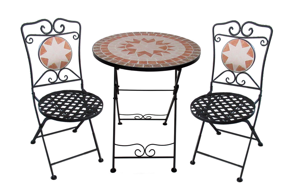 - Set pieghevole in ferro composto da: 2 sedie con inserto in mosaico su schienale + 1 tavolo tondo con piano in mosaico