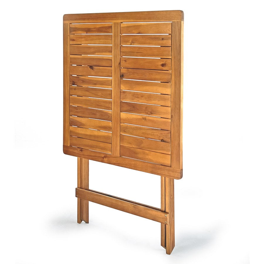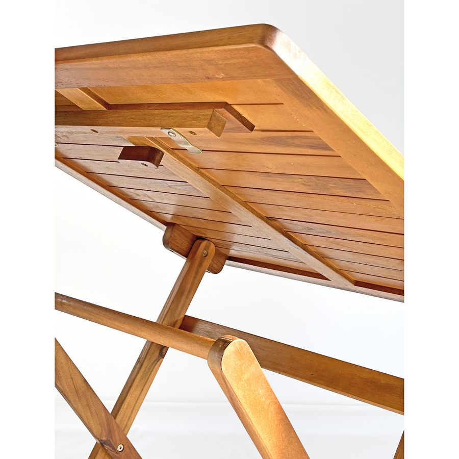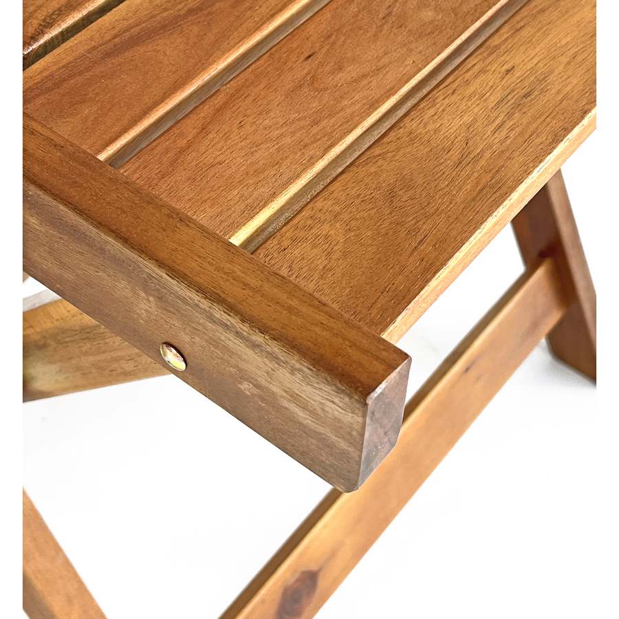 Il set Genova è composto da due sedie pieghevoli in legno con doghe su schienale e seduta, abbinate ad un tavolino, anch'esso facile da ripiegare, sempre con l'intera struttura in legno e con doghe che rendono tutto molto resistente e coerente. Le due sedie da giardino in legno sono dotate di cuscini da esterno per la loro seduta compresi nel prezzo.